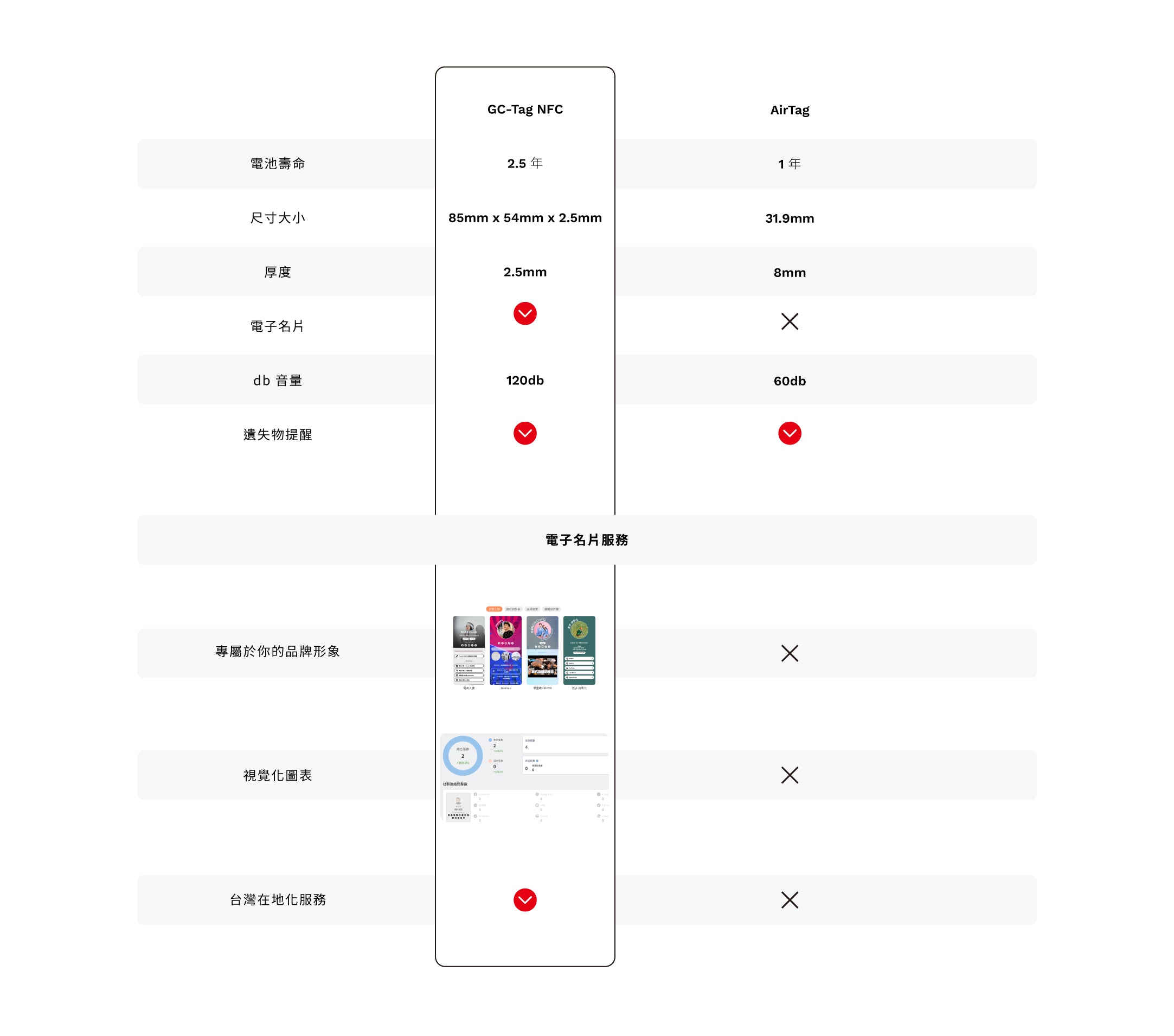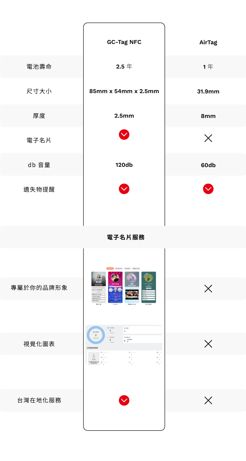 GC-Tag Card 和 Apple AirTag 都是高效的追蹤器,然而 GC-Tag Card 具有額外的數位名片功能,並且設計為信用卡大小,更加輕薄且便於攜帶。另外,兩者的操作和兼容性基本相同,您可以根據個人需求選擇適合的產品。