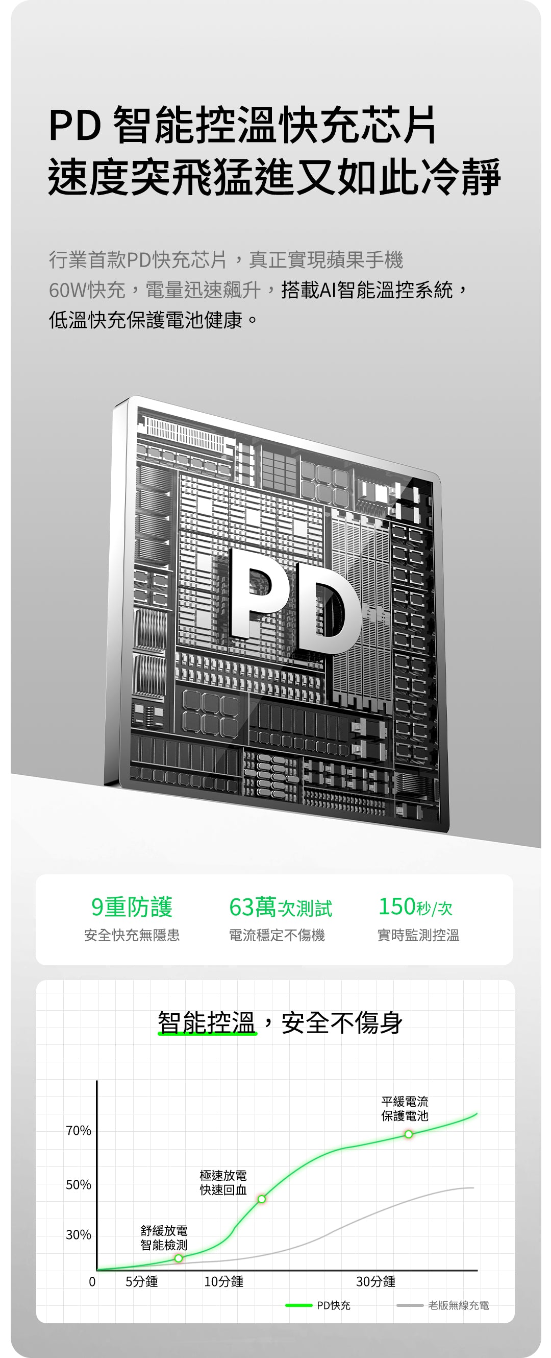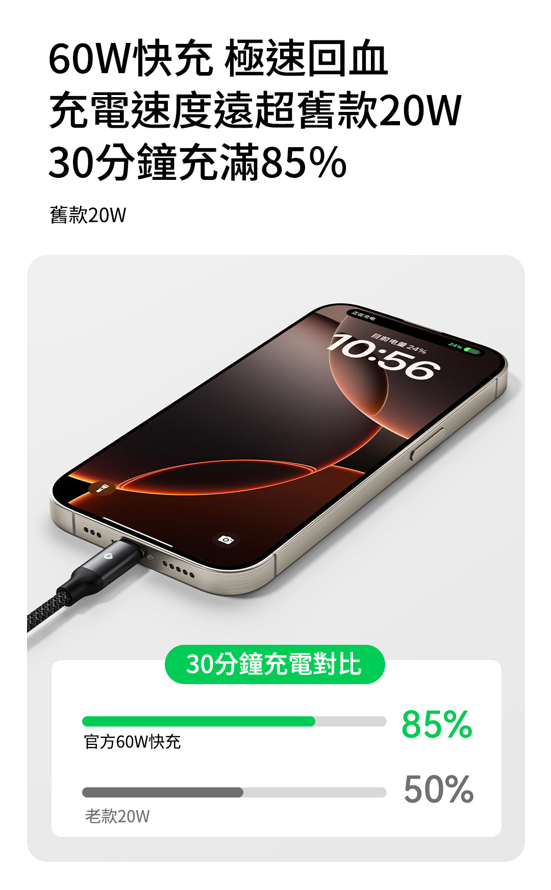 60W快充效能:支援 PD 快充協議,30 分鐘充電最高達 85%
