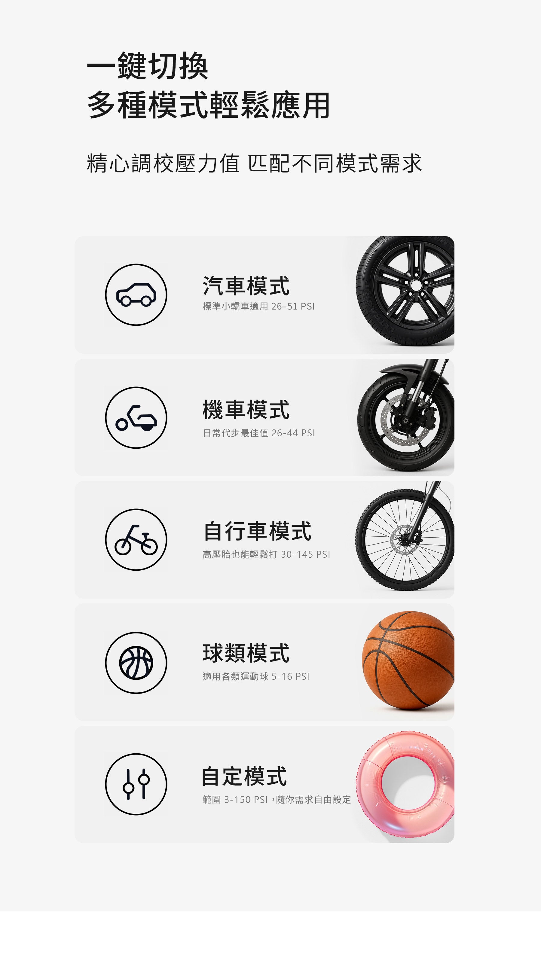 四大預設模式:汽車、機車、自行車、球類一鍵切換使用