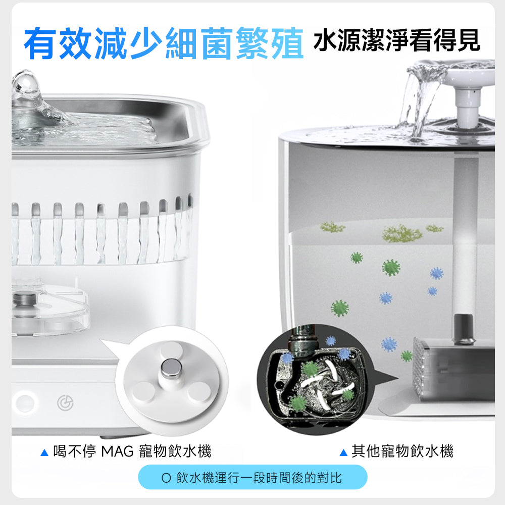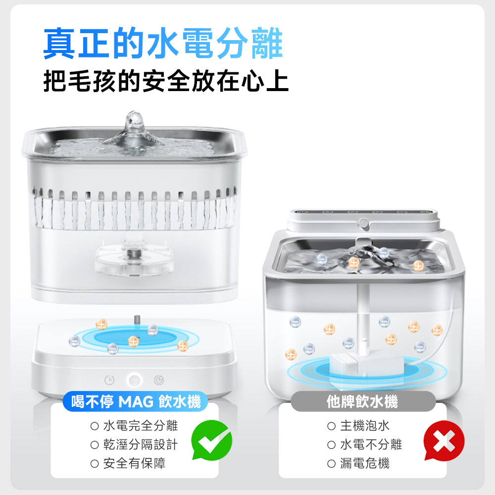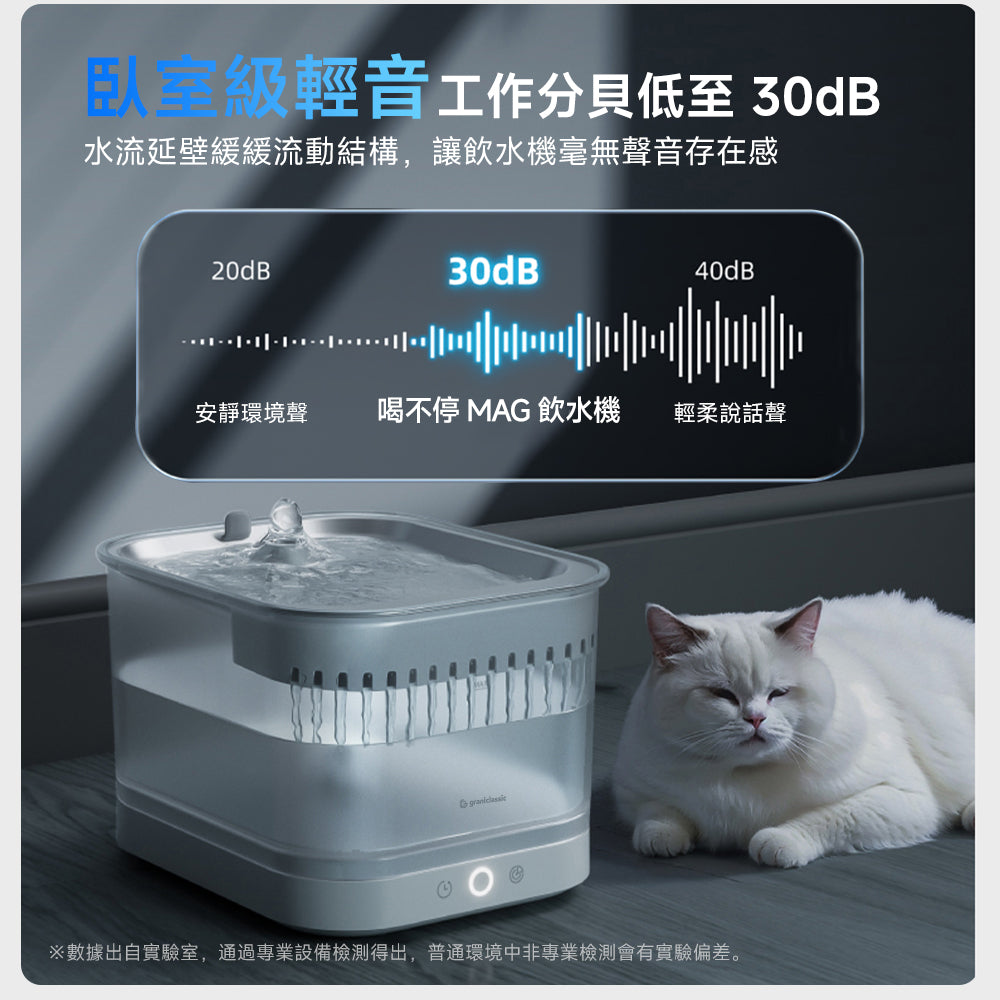 喝不停 Mag是一款寵物全自動智能磁力飲水機,專為挑剔的毛孩打造最潔淨安心的飲水環境。大容量 7500mAh 電池與 2.5L 水箱,帶來長達 60 天的超強續航,隨時供應新鮮水源。