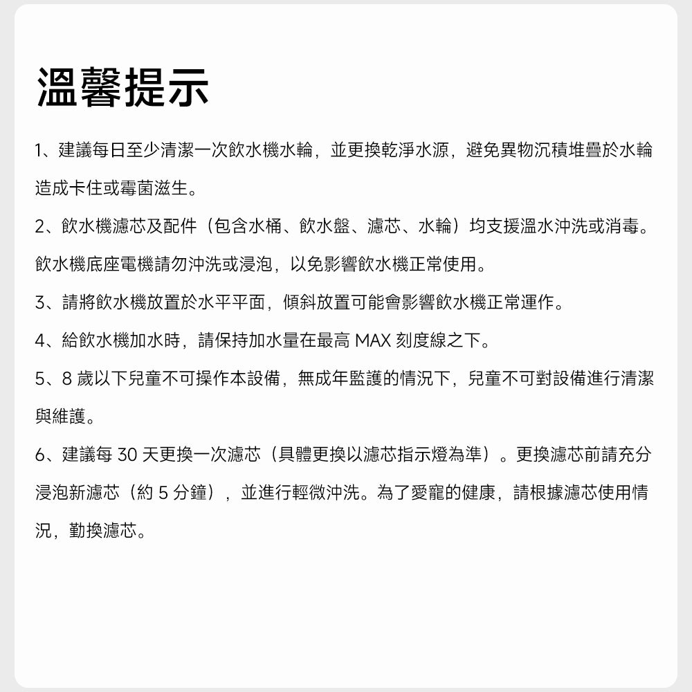 • 建議每月更換一次濾心,以確保水質清潔,保護您的寵物健康。