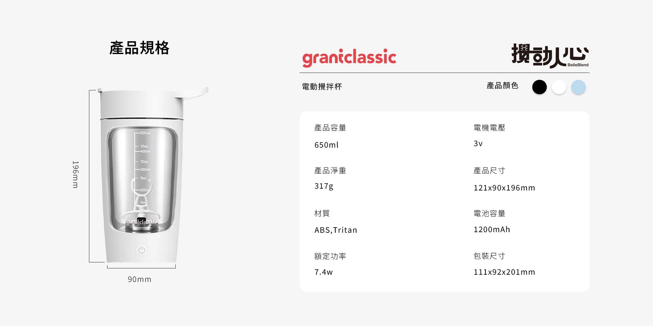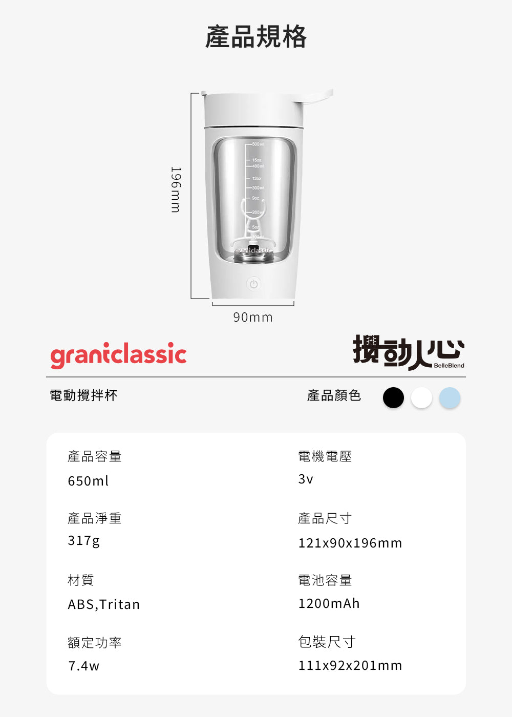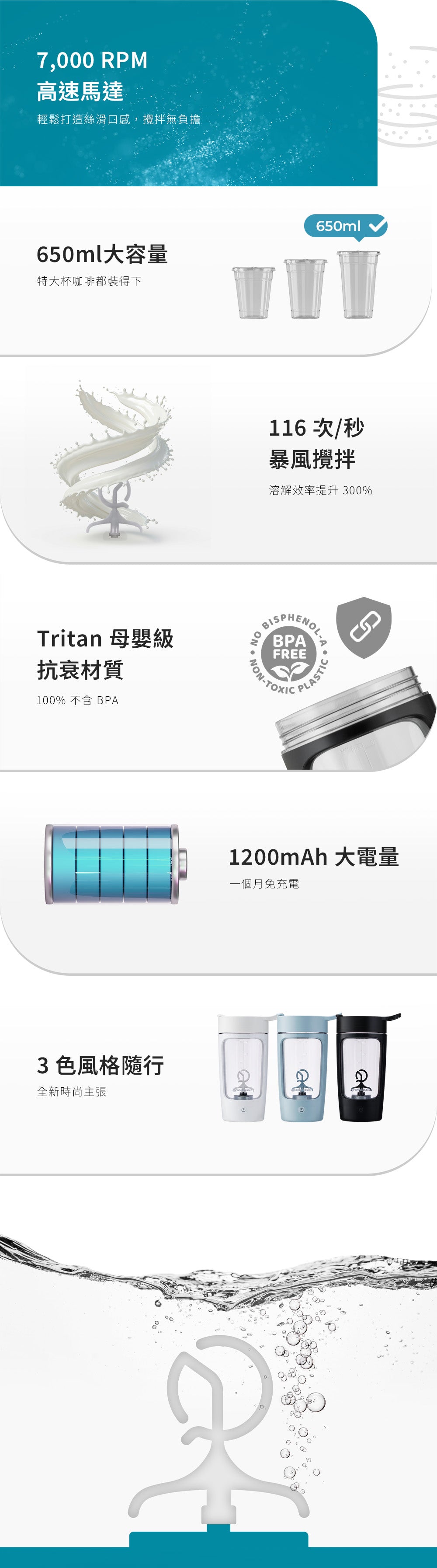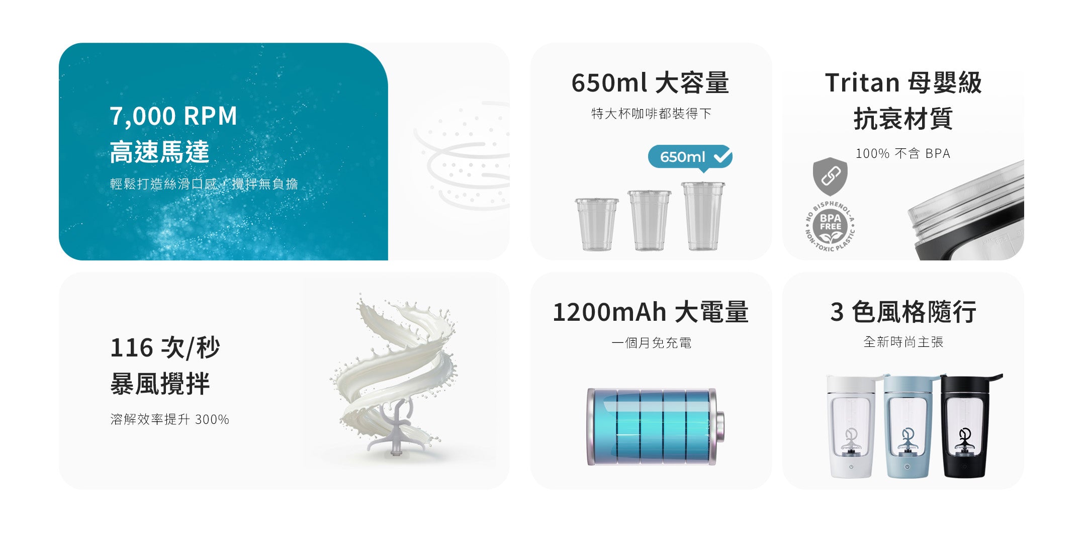 採用每秒116次的強力馬達,實現暴風式攪拌,溶解效率提升300%,輕鬆應對各種粉末飲品,讓每一口都細膩順滑。650ml超大容量設計,無論是特大杯咖啡還是健康奶昔,都能輕鬆容納,滿足多場景需求。內置1200mAh USB充電電池,一次充電可持續使用長達一個月,告別頻繁充電的煩惱,輕量化設計更適合健身、旅行與辦公攜帶,隨時隨地享受健康生活。選用Tritan母嬰級食品材質,100%不含BPA,安全無憂,呵護健康。一鍵啟動操作簡單,攪拌快速高效,搭配無殘留平滑杯底,清潔更輕鬆。三種時尚配色展現個性風格,讓您的健康生活更具品味與質感。
