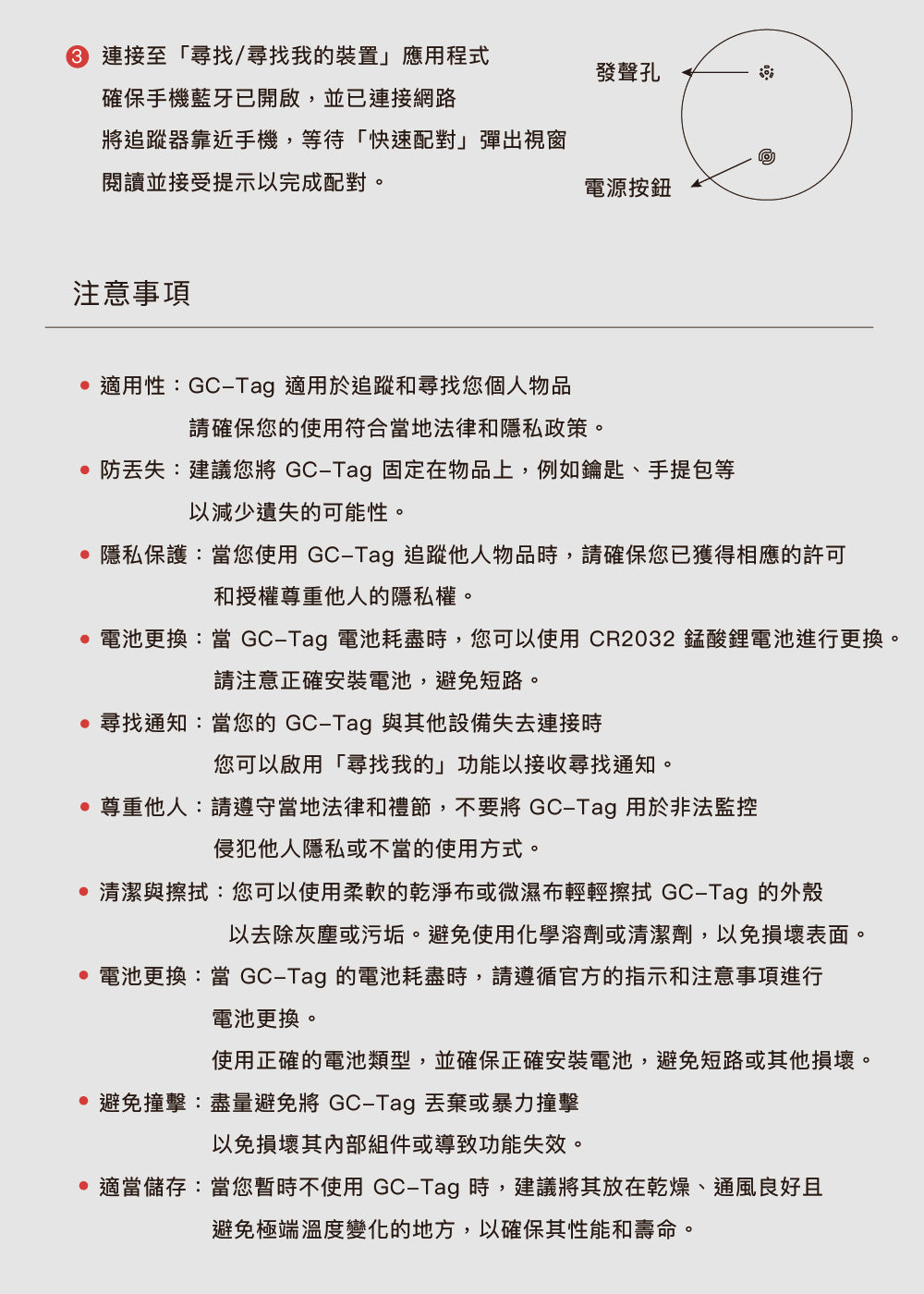 GC-Tag 可透過手機的「尋找」App(iOS)或「尋找我的裝置」App(Android)連線使用。當你物品遺失或超出設定距離時,系統會自動發出通知,並可在地圖上顯示最後位置,協助你迅速找回。