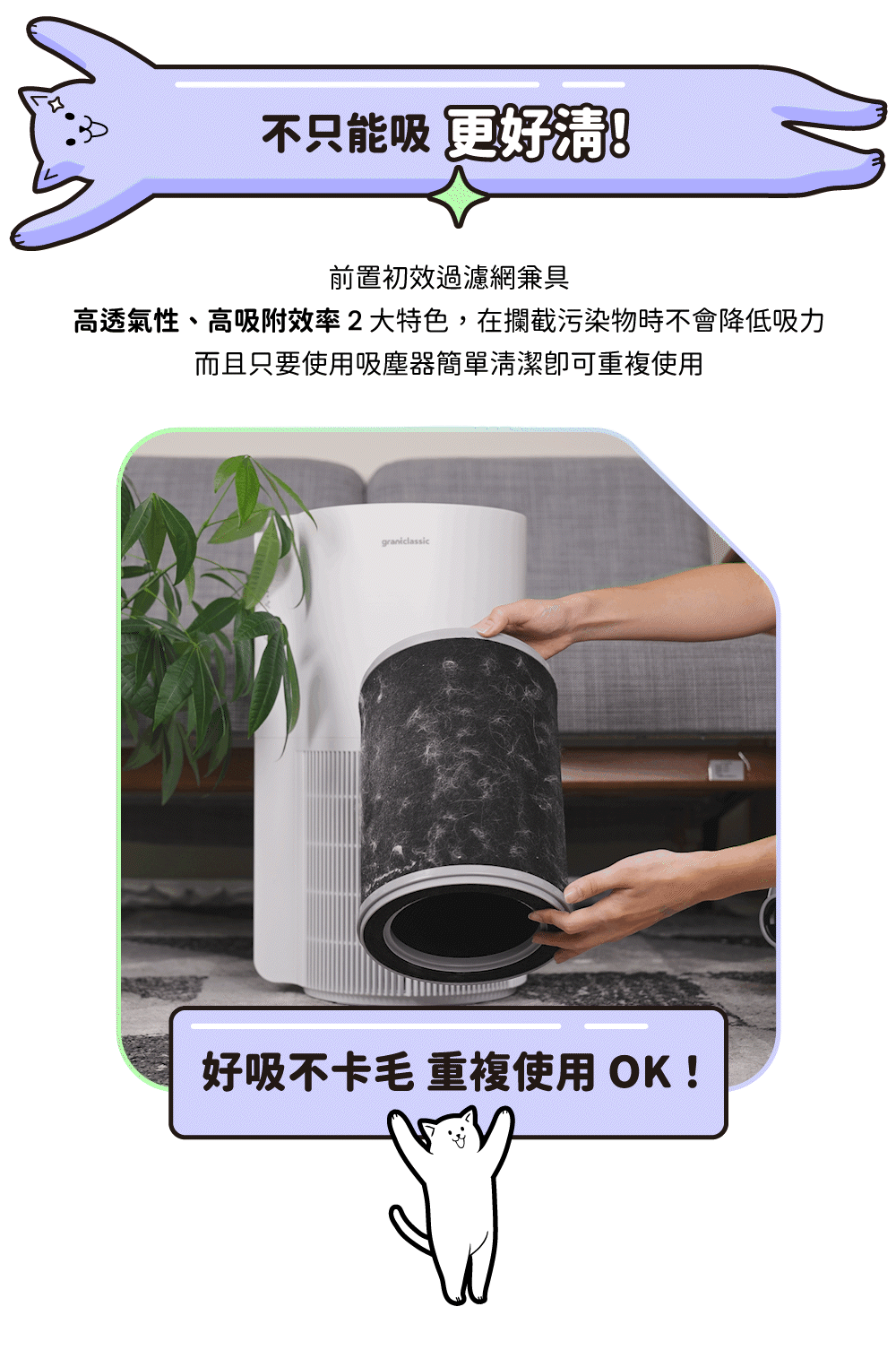 > 浮毛、灰塵、棉絮,等大分子污染物 *清潔後可重複利用