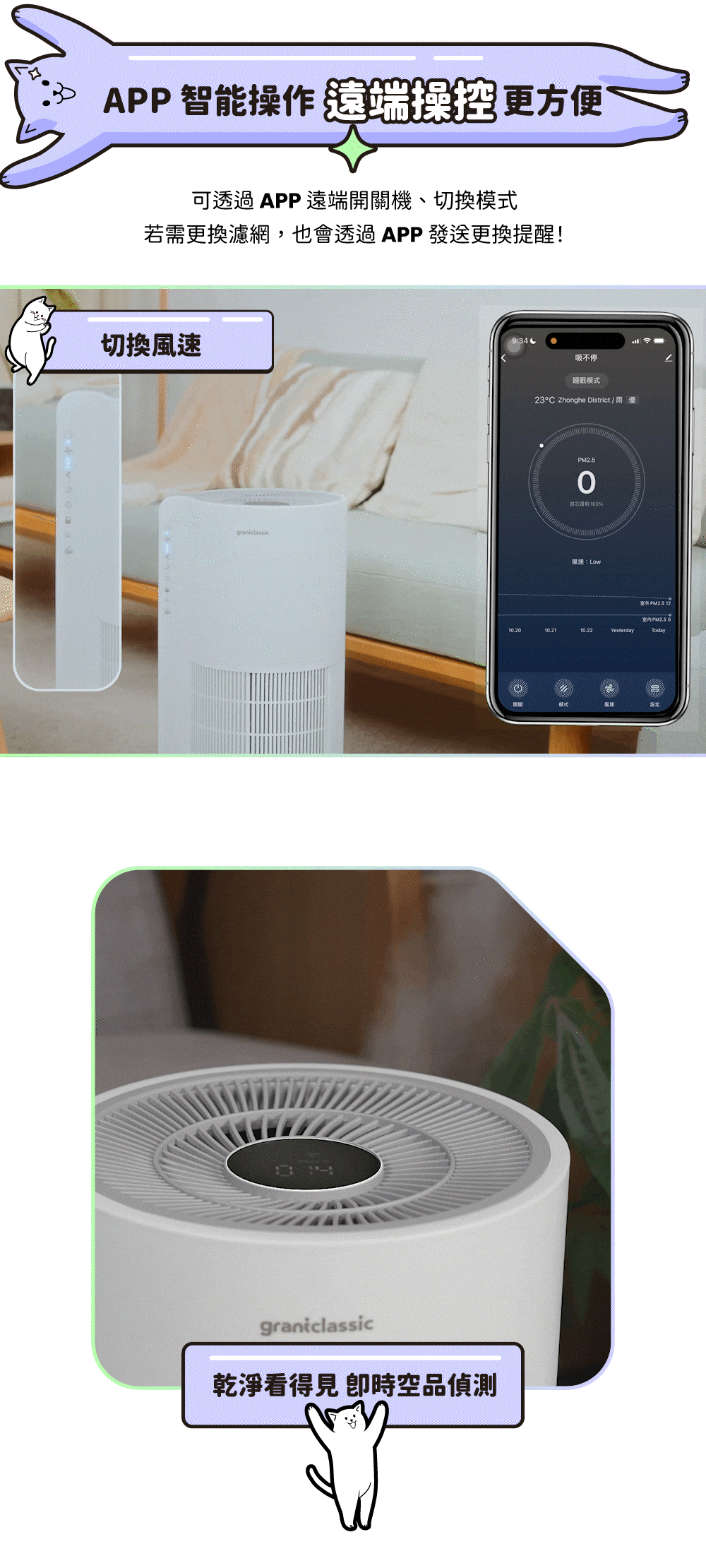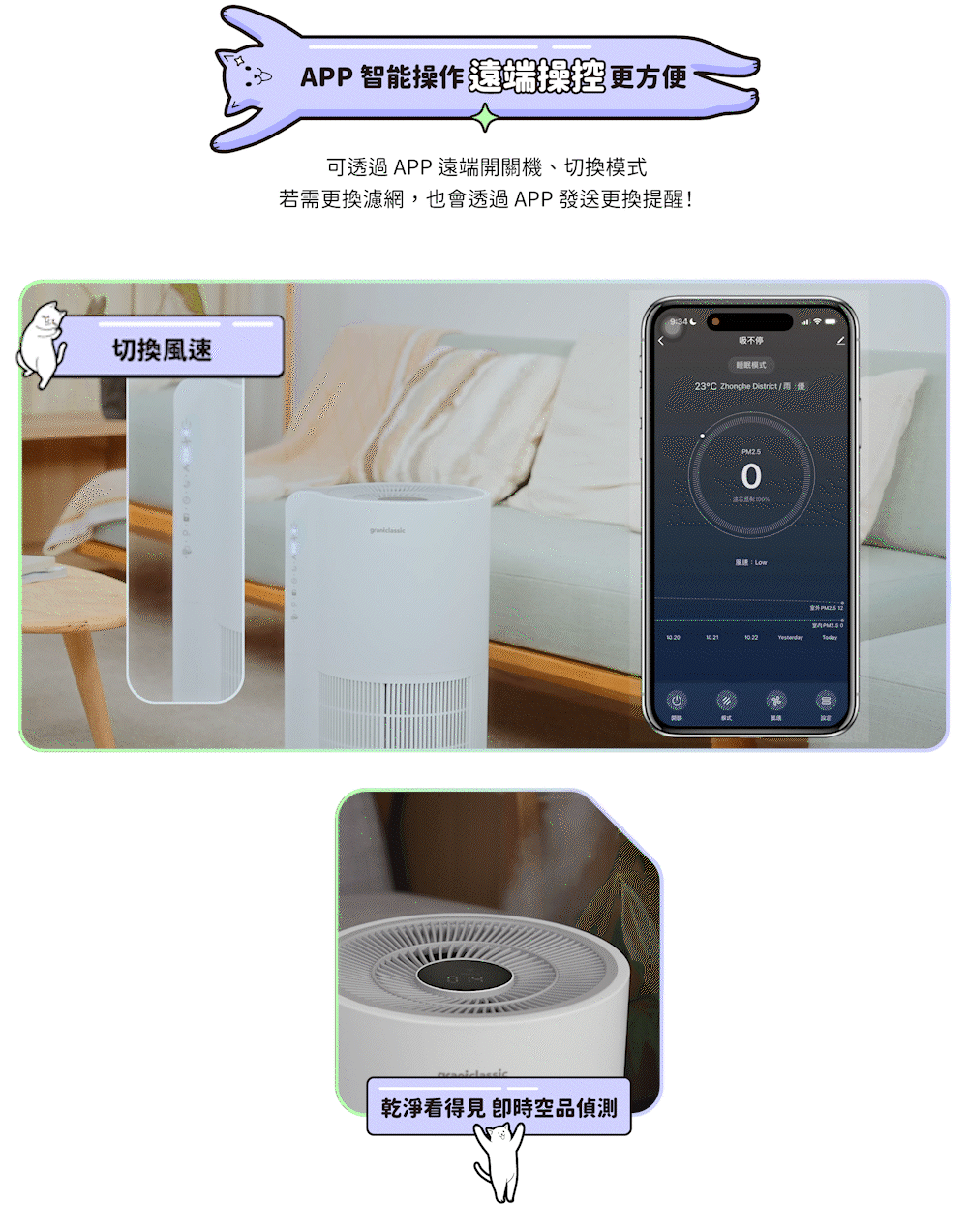 直接使用機身上的觸控面板或是連線APP,都可以隨時調整風速。