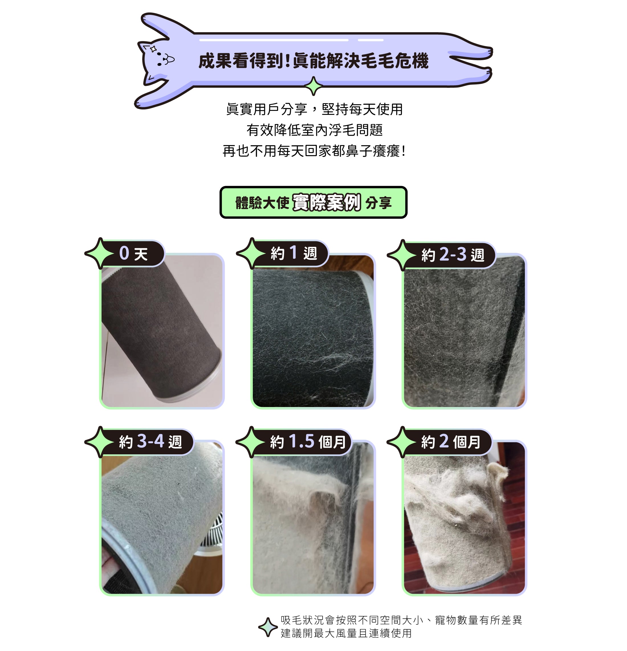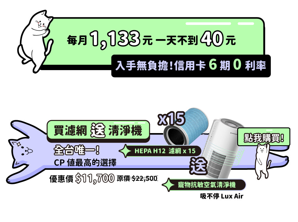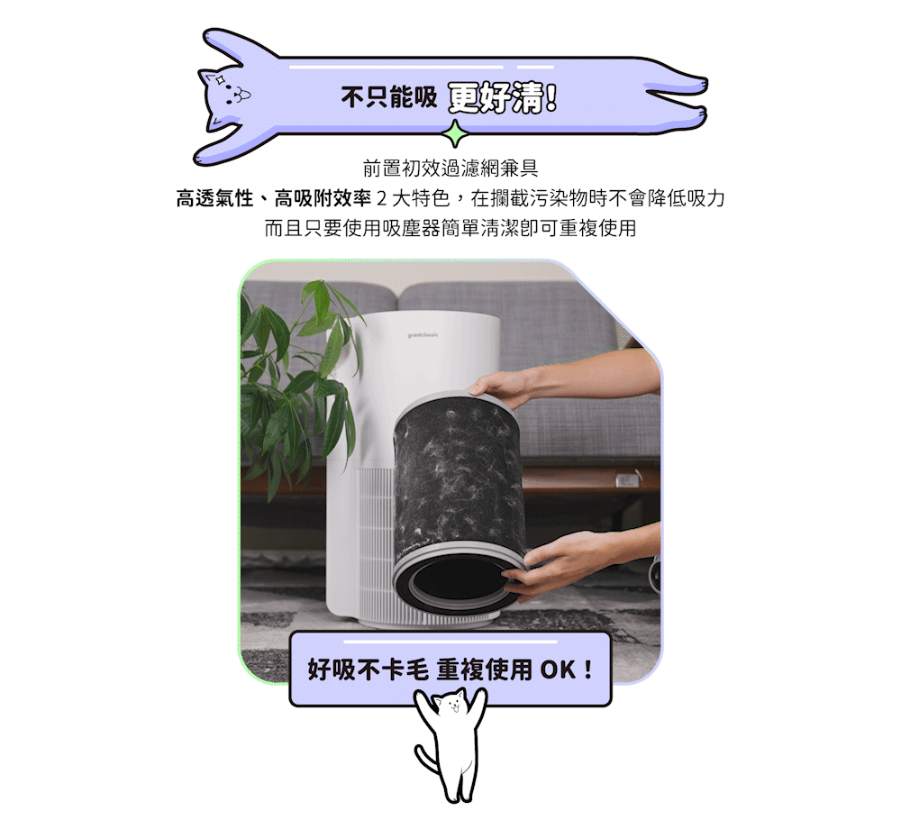 可以用吸塵器清潔你的初效前置濾網,可以有效避免因前置濾網吸附過多毛髮影響淨化效率;HEPA 濾網更換時間,仍建議以 3 - 6 個月及濾網更換指示燈亮起為主。