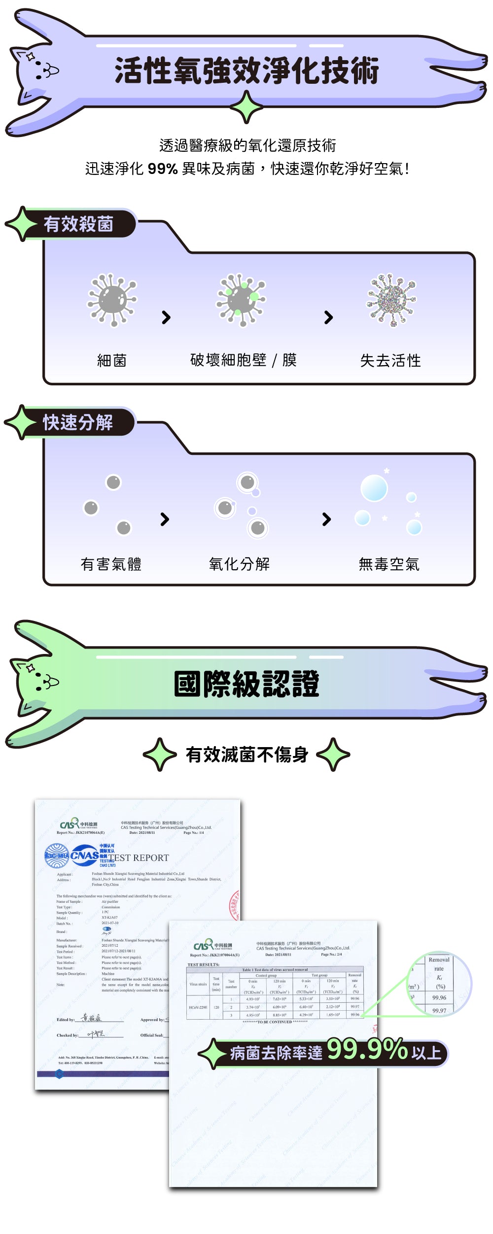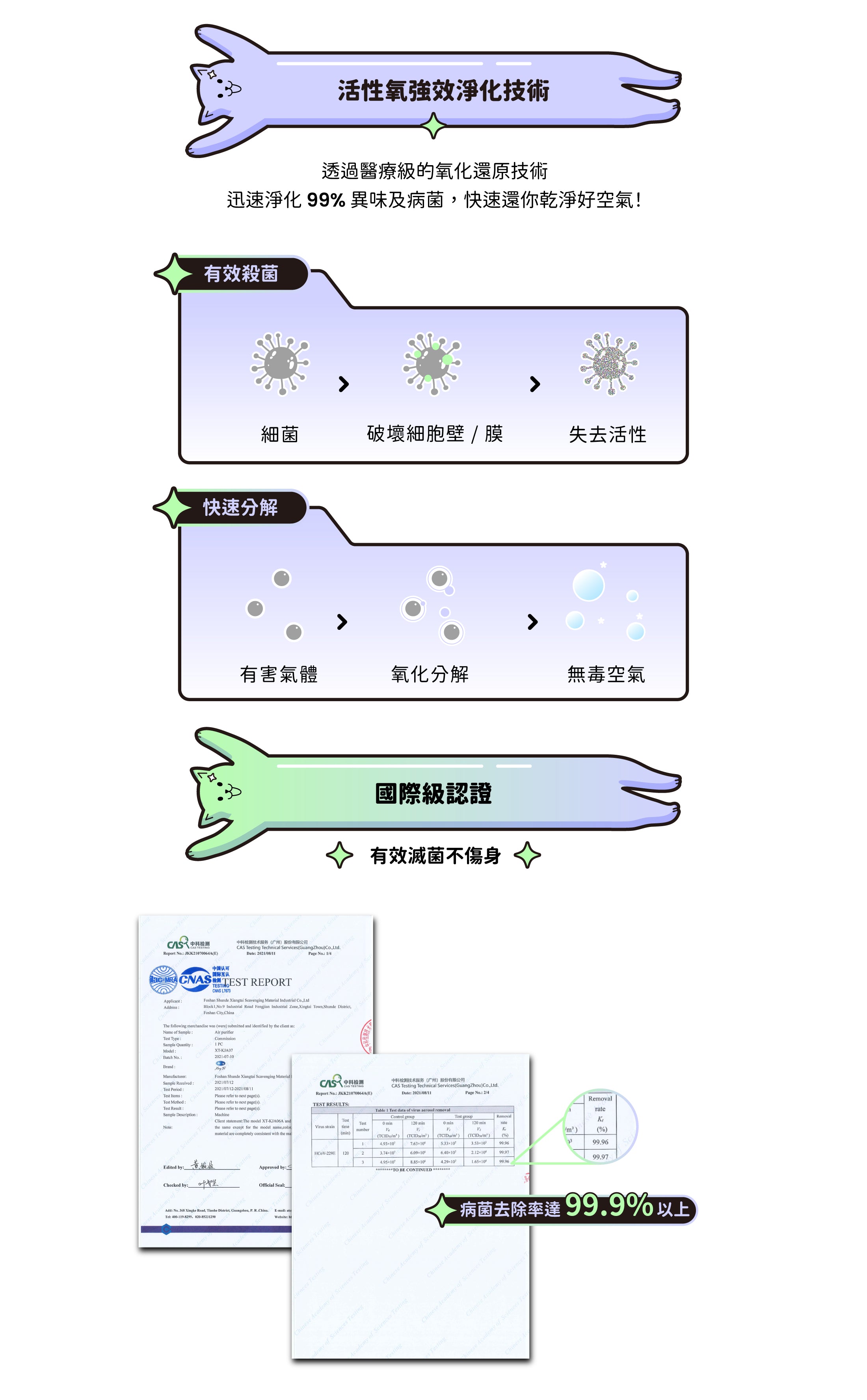 透過「負離子淨化 / 活性氧淨化」兩種模式即可降低空氣中甲醛濃度,建議若空間有寵物或人時,使用「負離子淨化」清除甲醛;室內無人時使用「活性氧淨化」,兩者結合能夠大的程度的避免甲醛超標的問題,守護身體的健康!