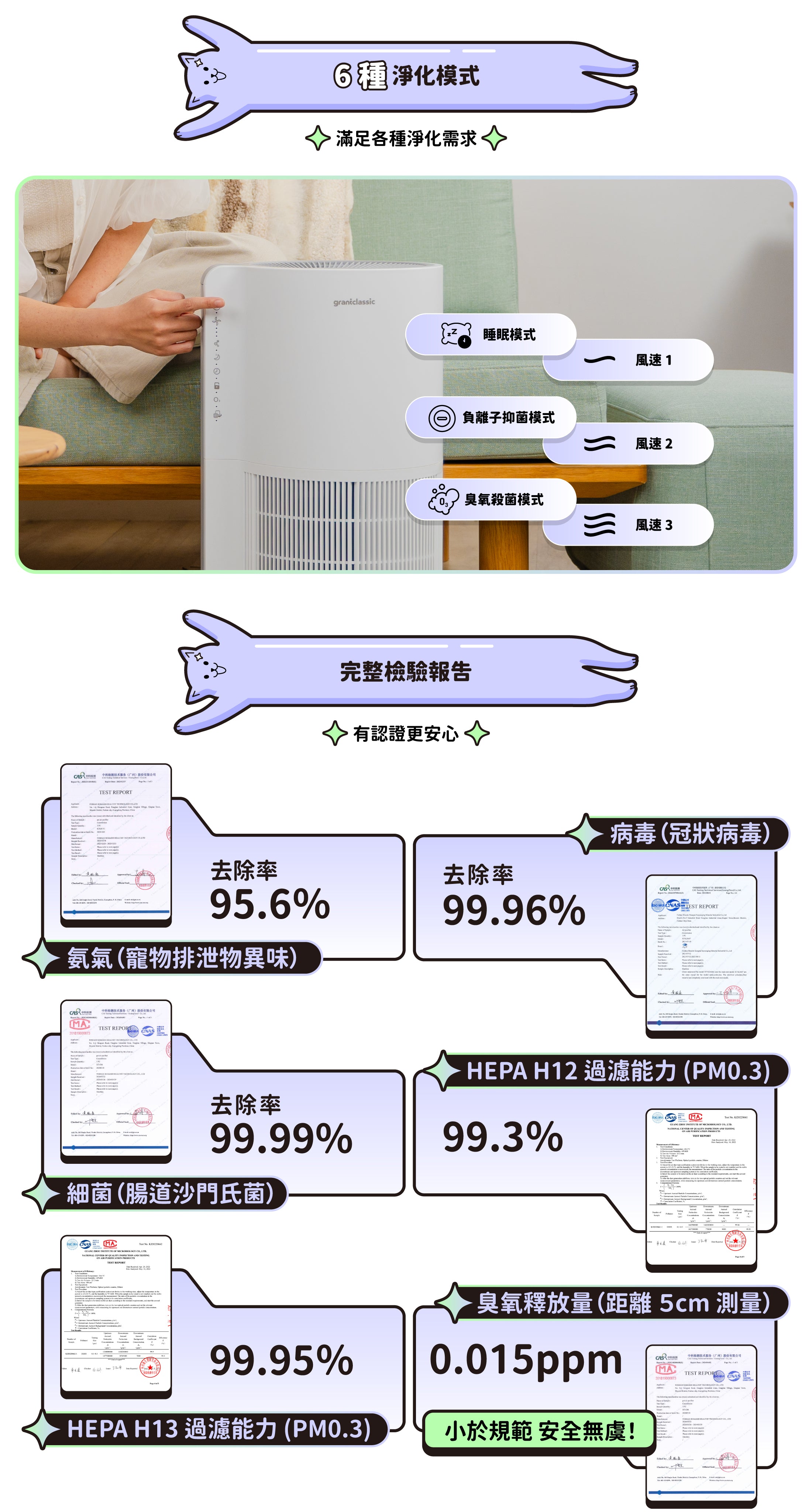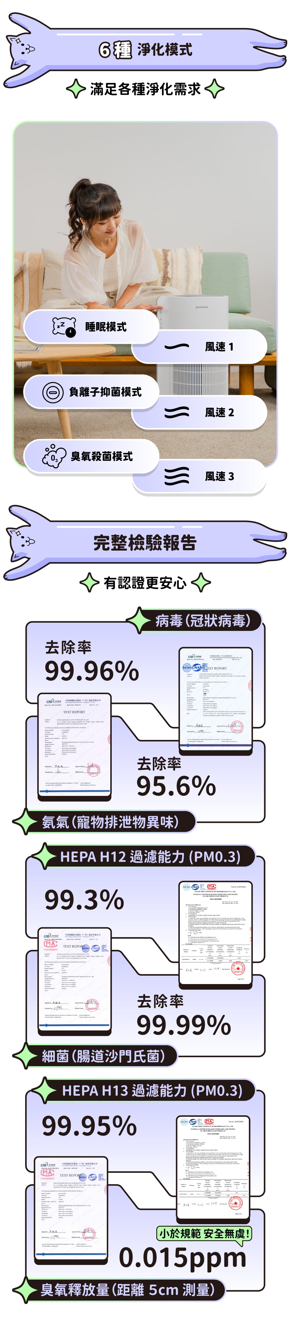 若單純是毛髮 / 塵蟎 / 皮屑過敏,HEPA 12 濾網即可過濾 99.5% 的過敏原,無需開啟特定模式;若希望去除寵物異味(排泄物味等),可以開啟負離子淨化 / 活性氧淨化 2 種模式,針對氣味去除進行強化。