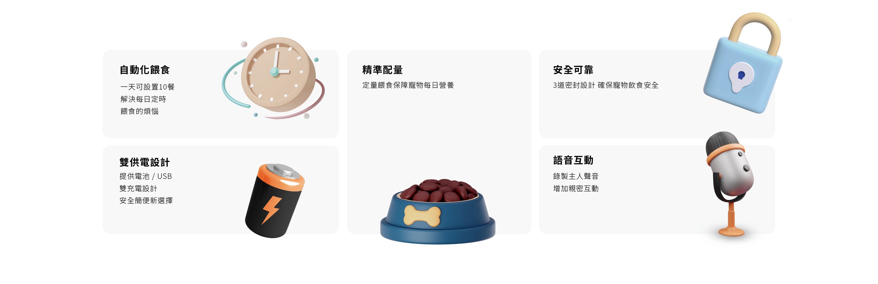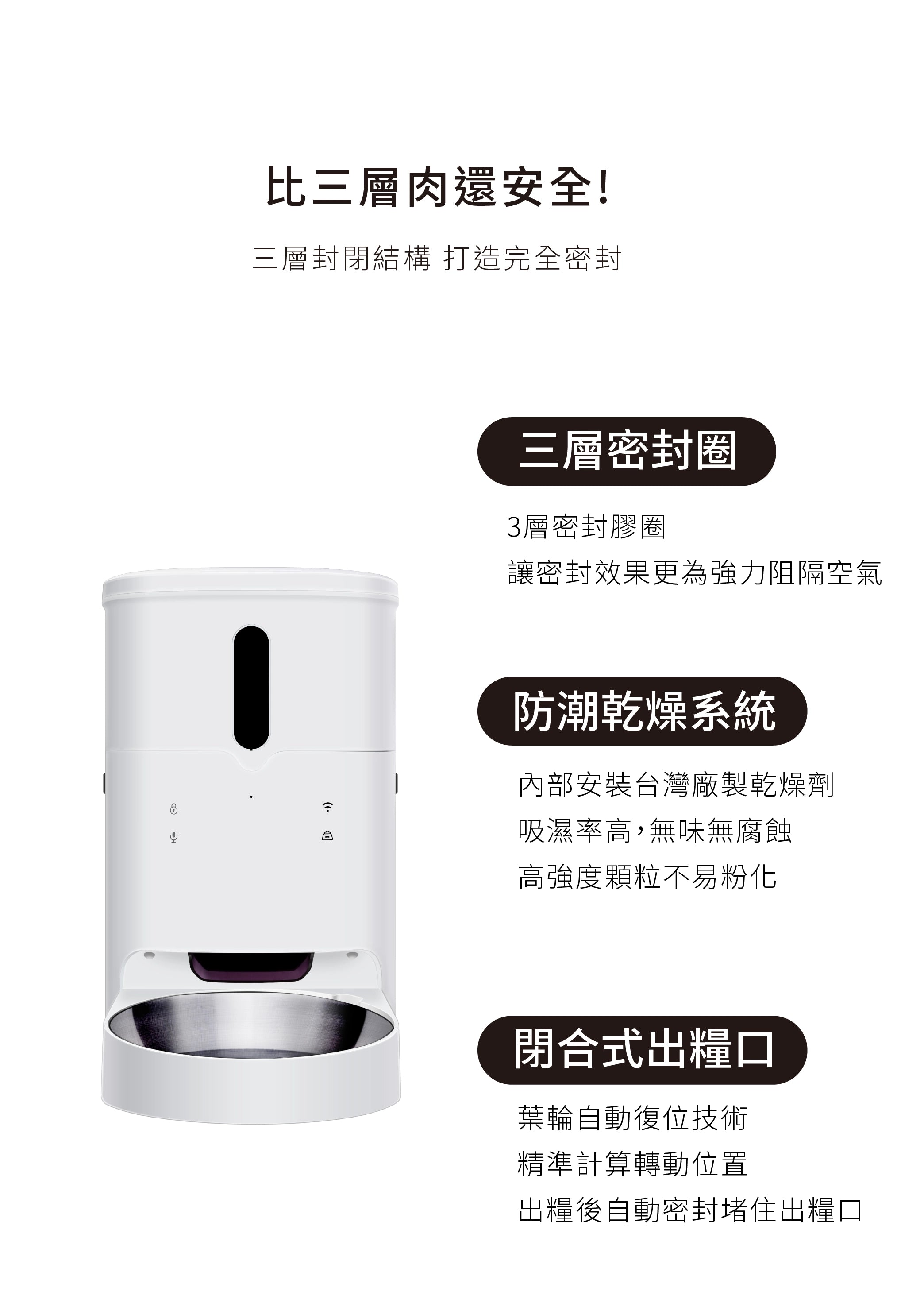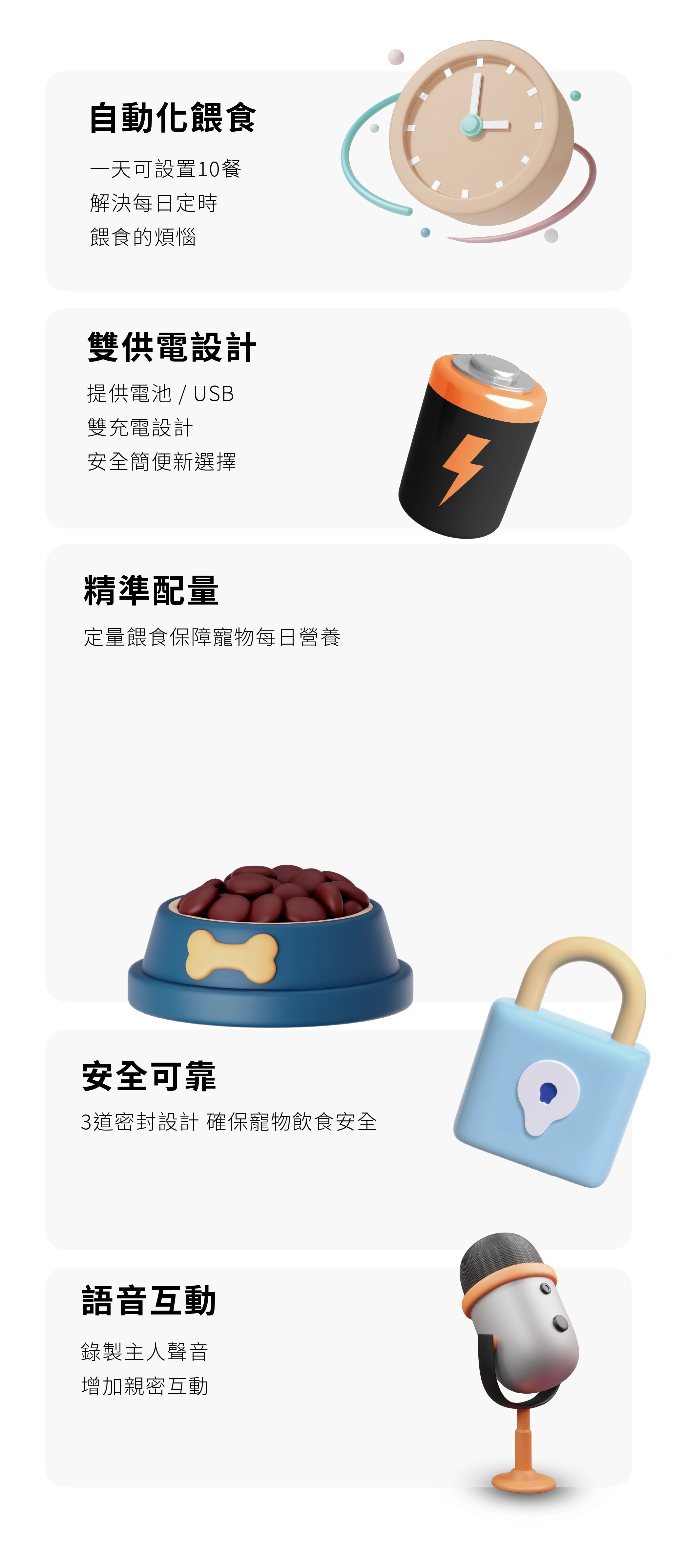 - 均衡營養:精確食量設定,均衡餵食。