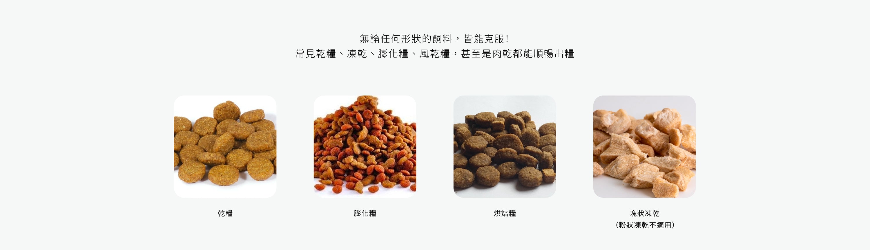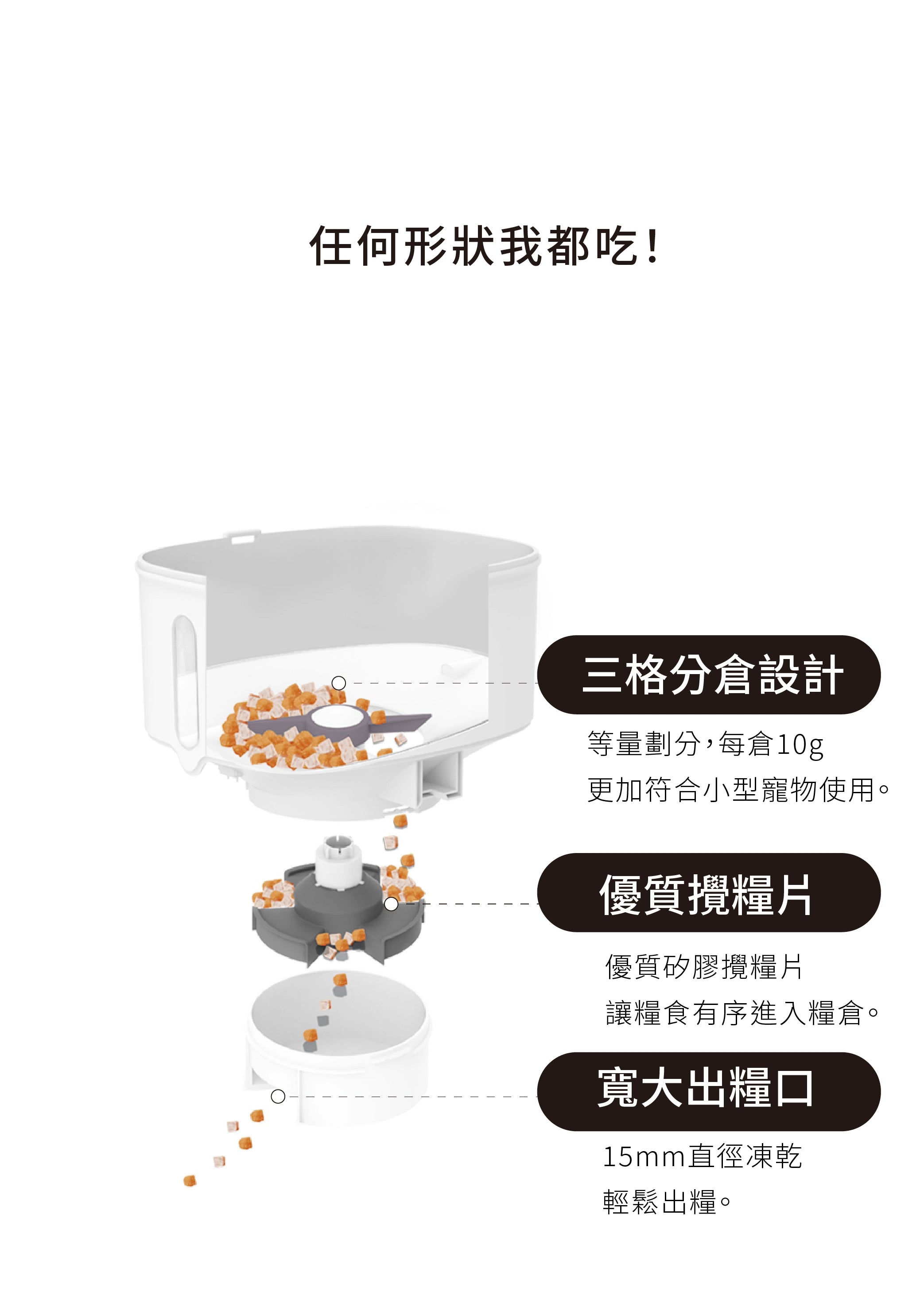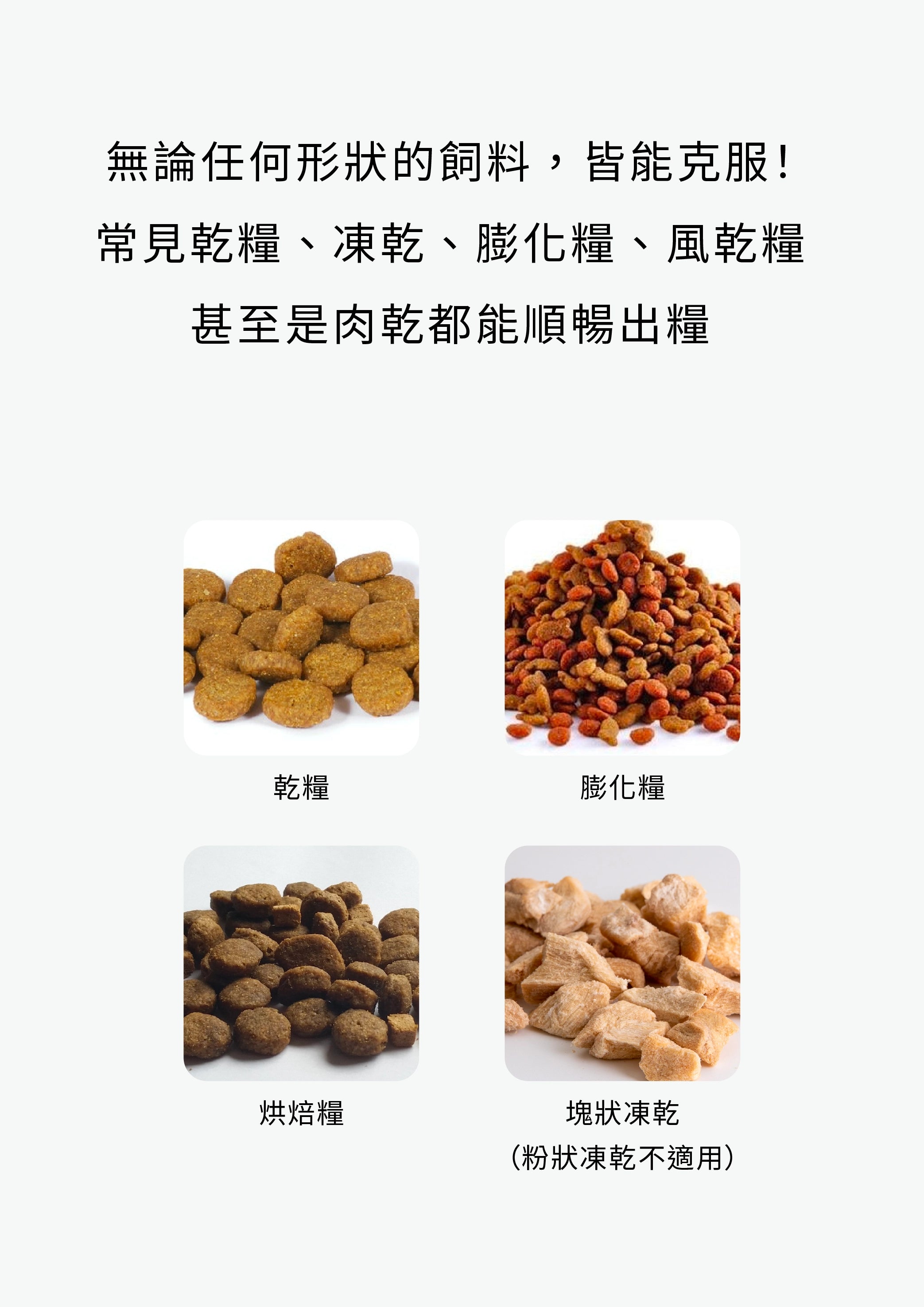 支援大多數乾性和半濕性飼料,請避免使用超大顆粒的飼料。