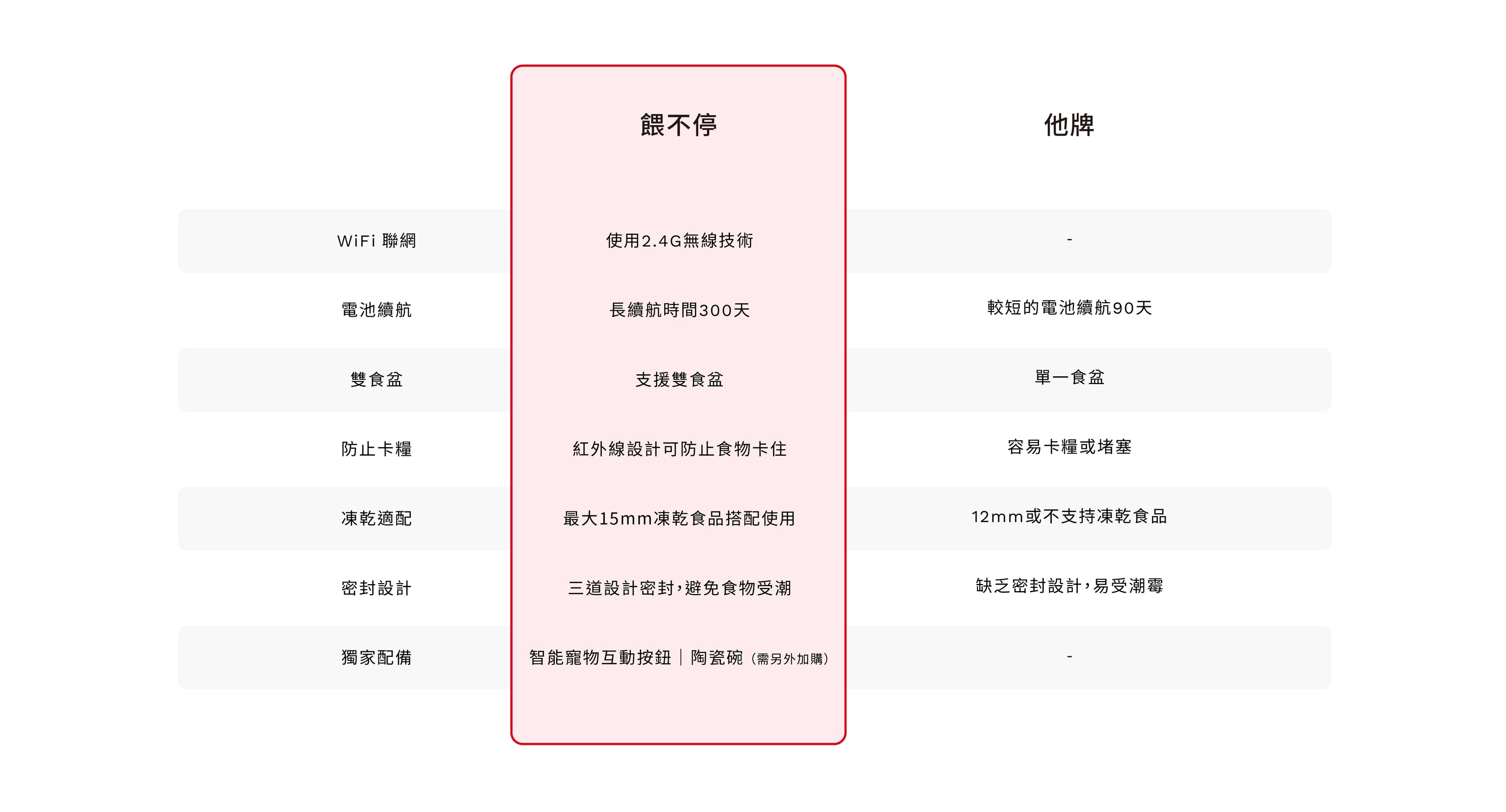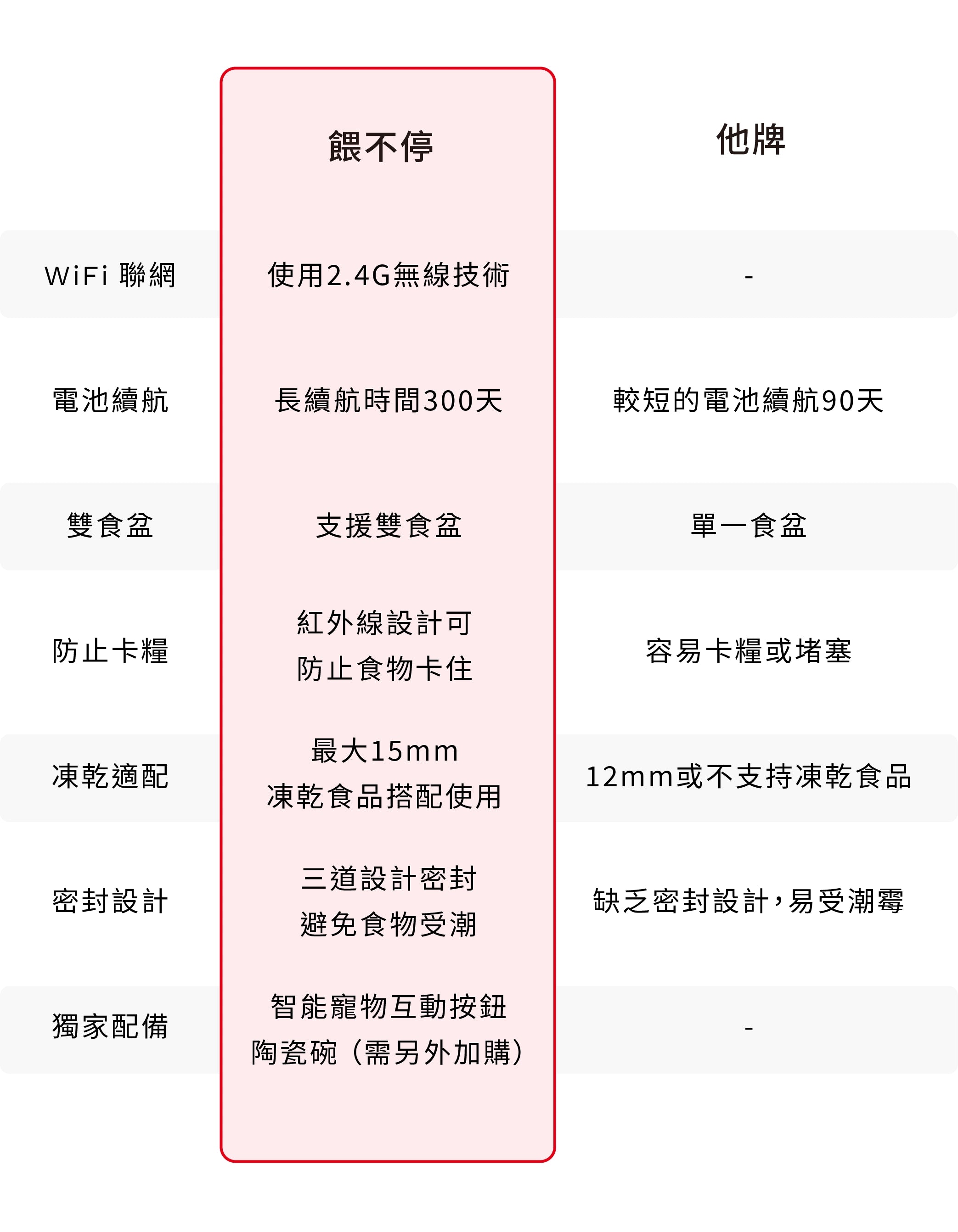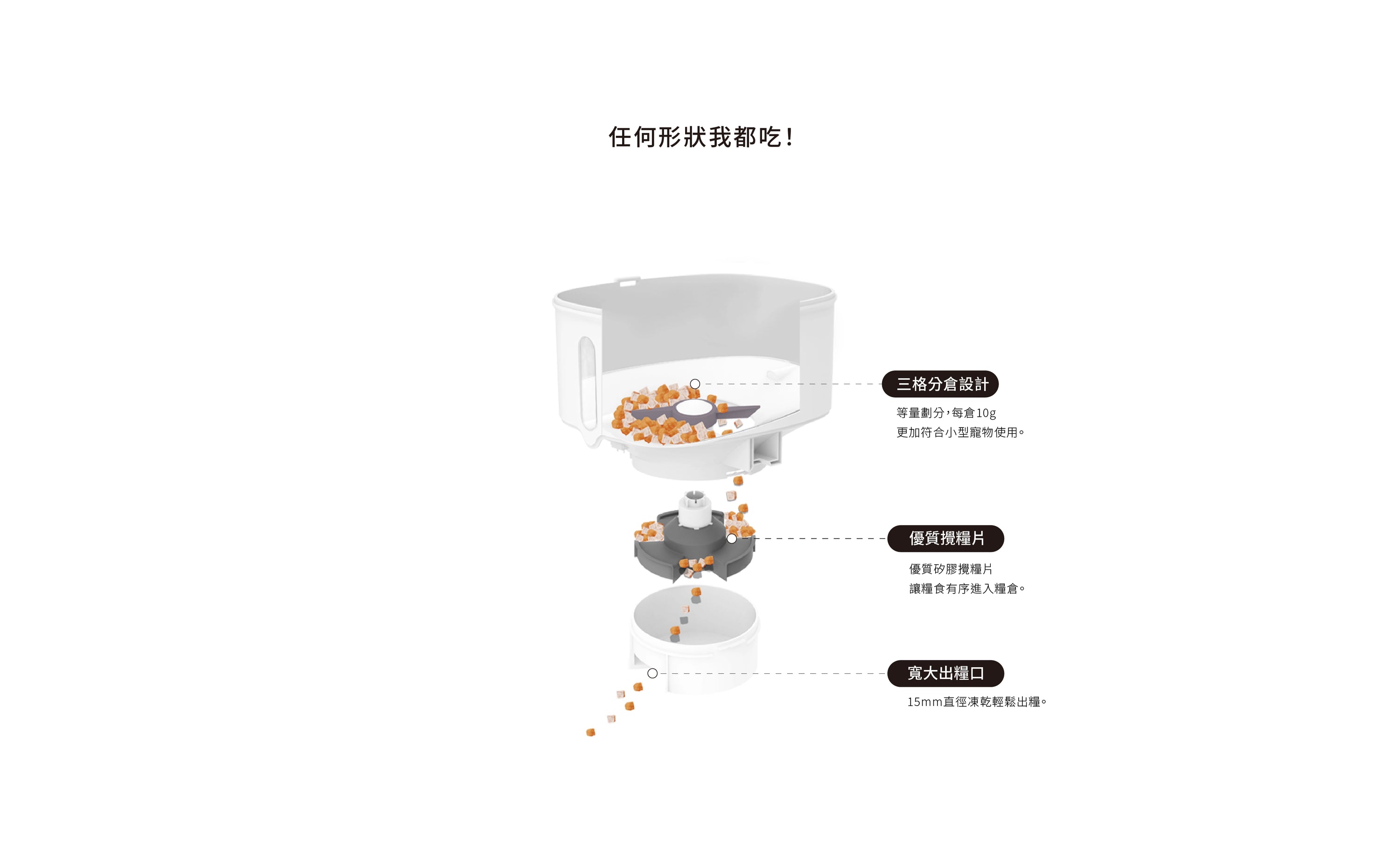 支援大多數乾性和半濕性飼料,請避免使用超大顆粒的飼料。