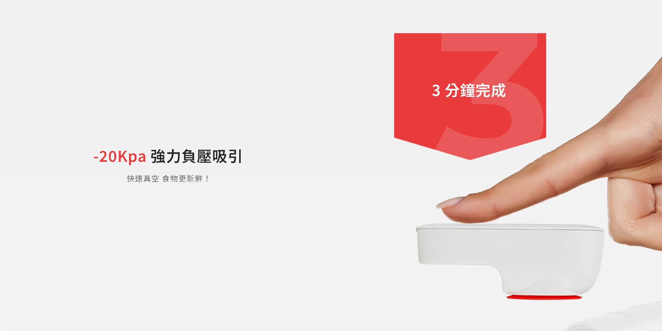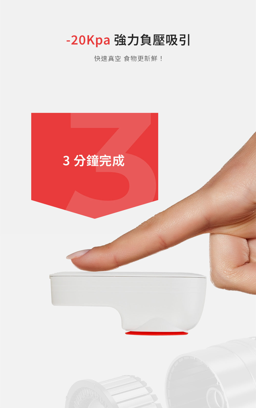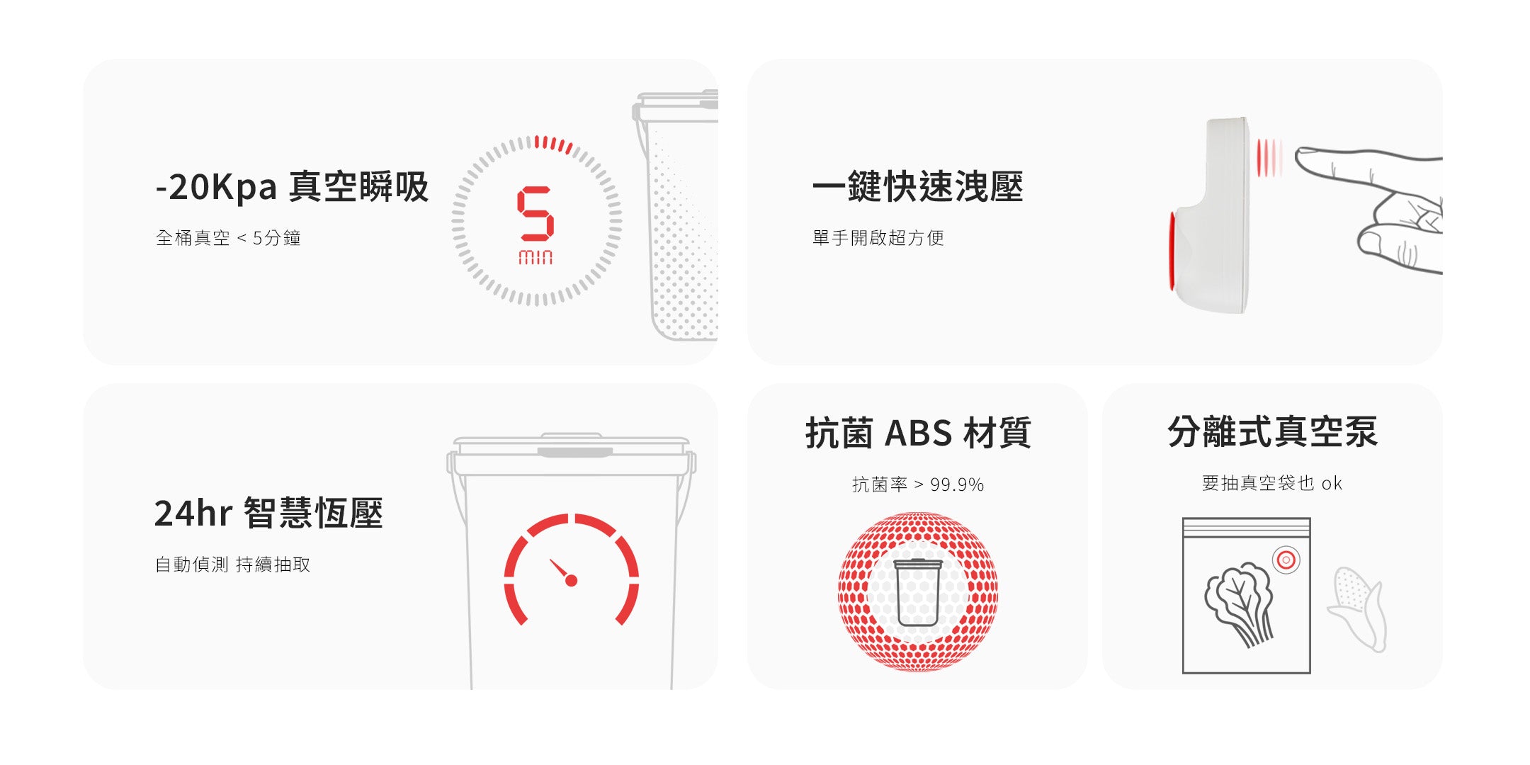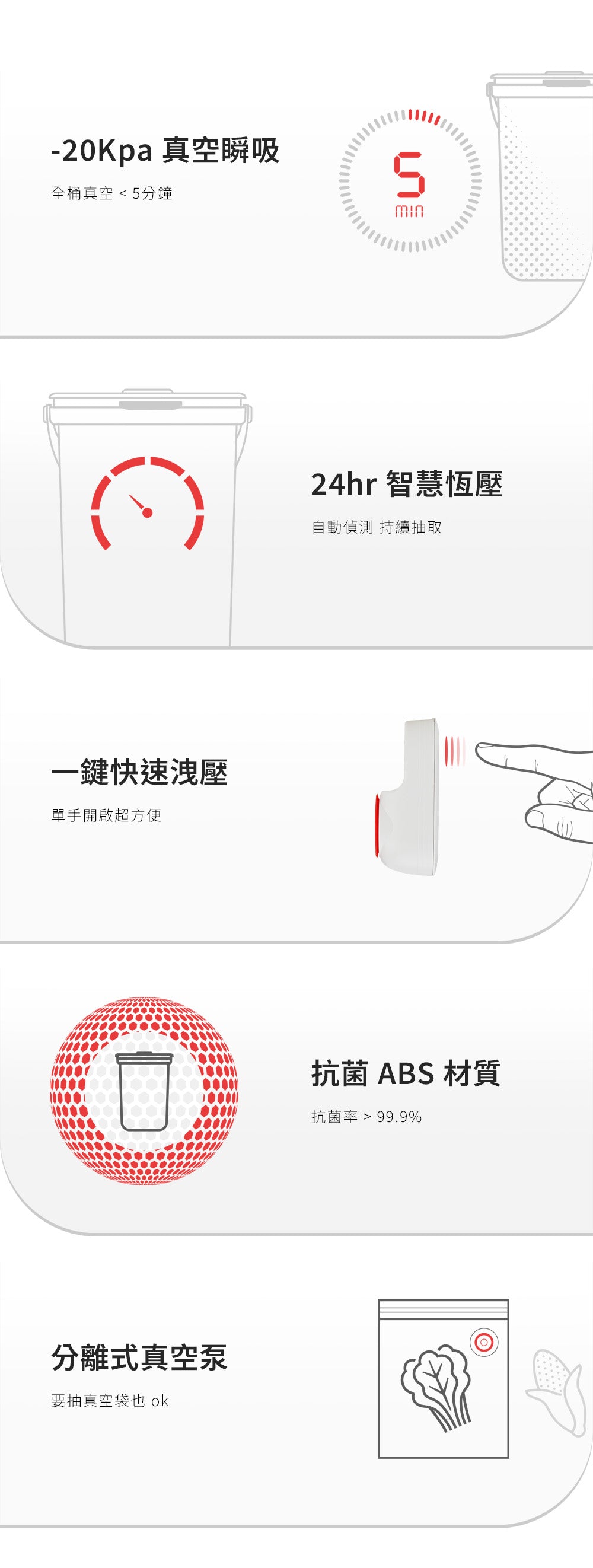 當桶內達到設定真空度後,抽氣動作會自動停止,且無法透過不按壓洩壓鍵方式開啟桶蓋,這時表示已完成真空封存。