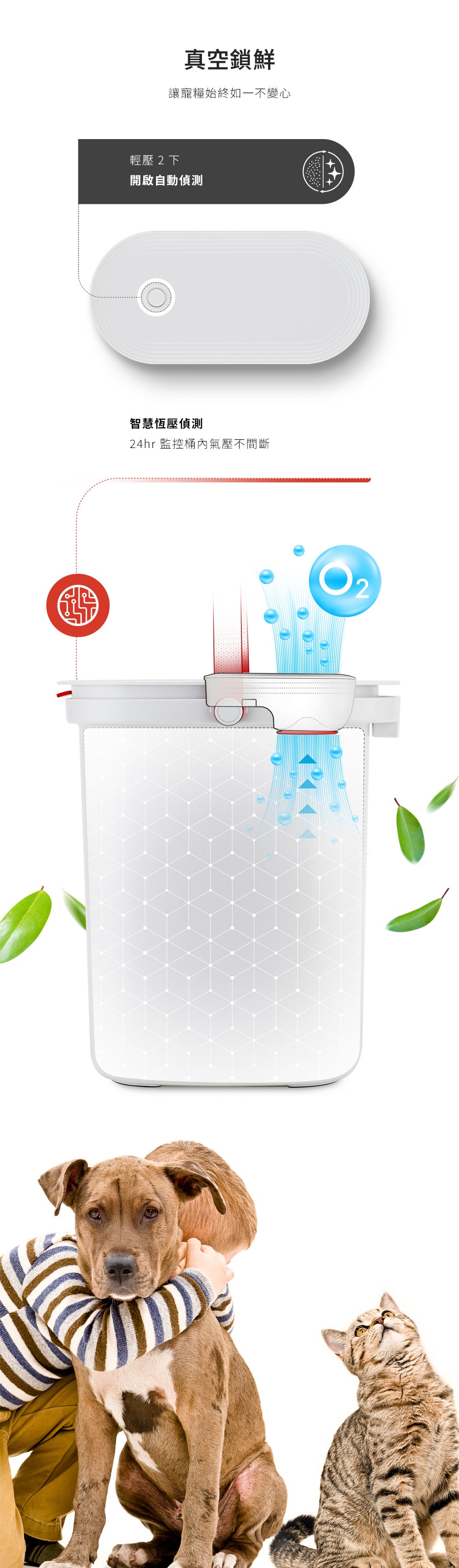 食材的品質,取決於保存的方式。全新智慧真空儲糧桶,運用『 -70Kpa 瞬吸技術』,僅需 5 分鐘即可達成全桶真空,徹底阻隔氧氣,防止潮濕、氧化與蟲害,讓糧食保持原始風味與最佳狀態。24hr 智慧恆壓系統,自動偵測內部氣壓,當壓力變化時即時補充抽氣,確保長效真空,真正做到持續保鮮、保持最佳口感。