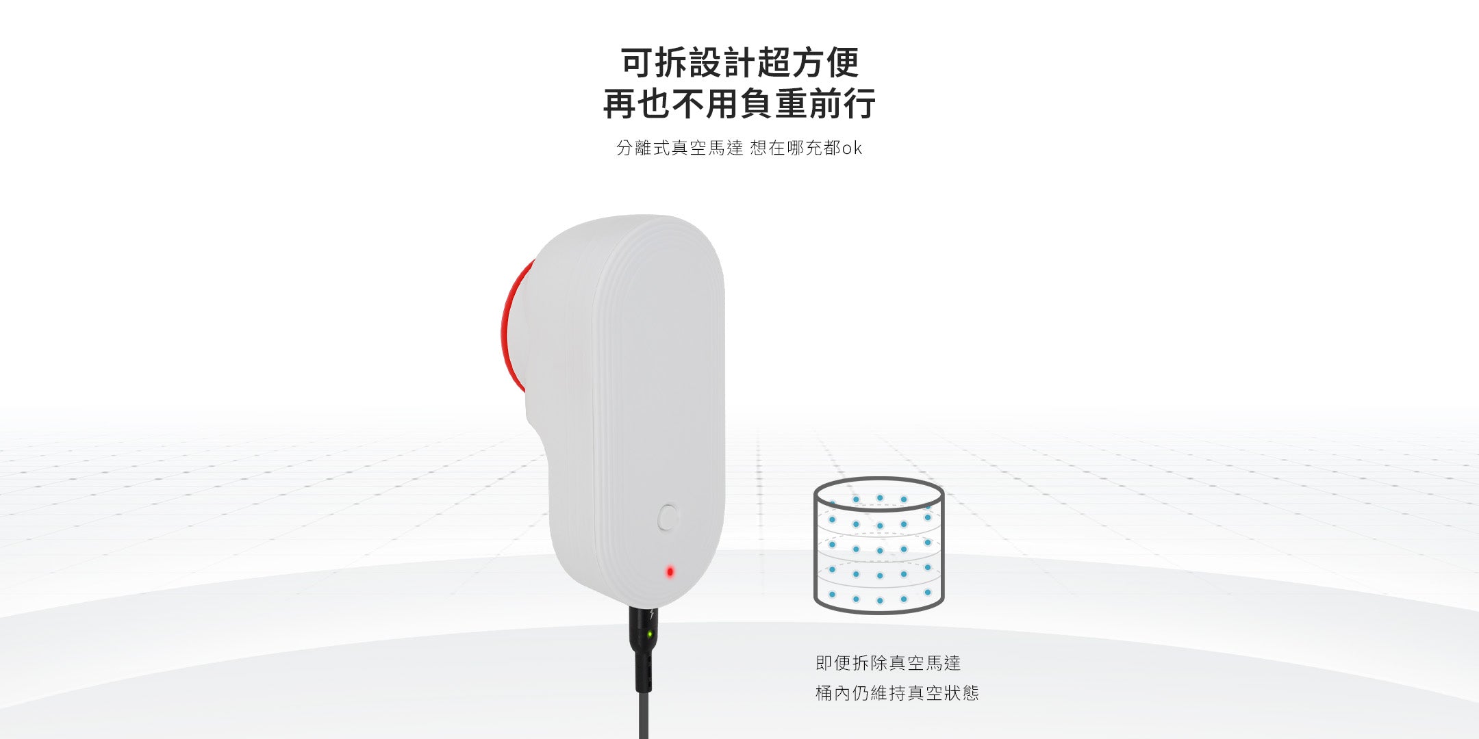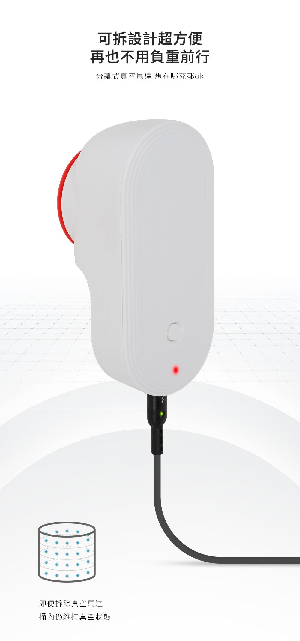 無需持續插電,分離式真空泵內建大容量電池,充飽電後可連續使用數週,充電一次即可滿足長時間需求。