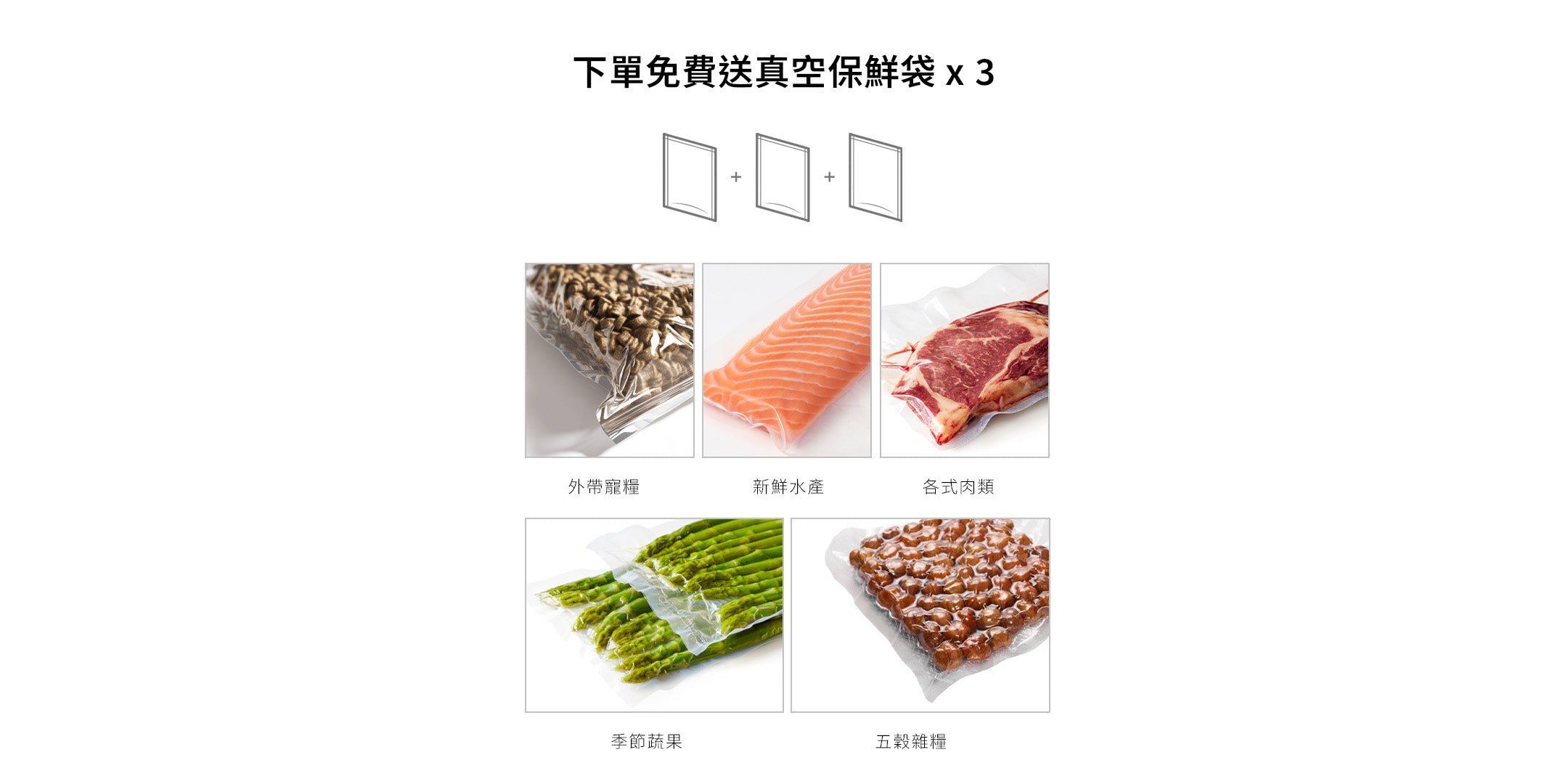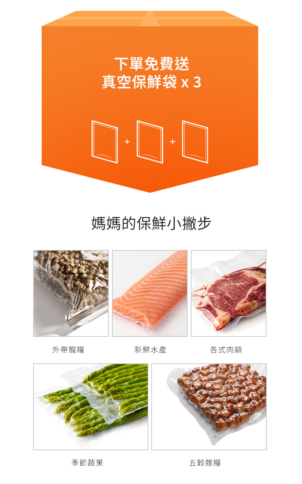 現在下單,加碼贈送真空保鮮袋x3,一次解決收納與保鮮需求。選擇更聰明的儲存方式,讓食材從此告別受潮、氧化,時刻保持極致新鮮!