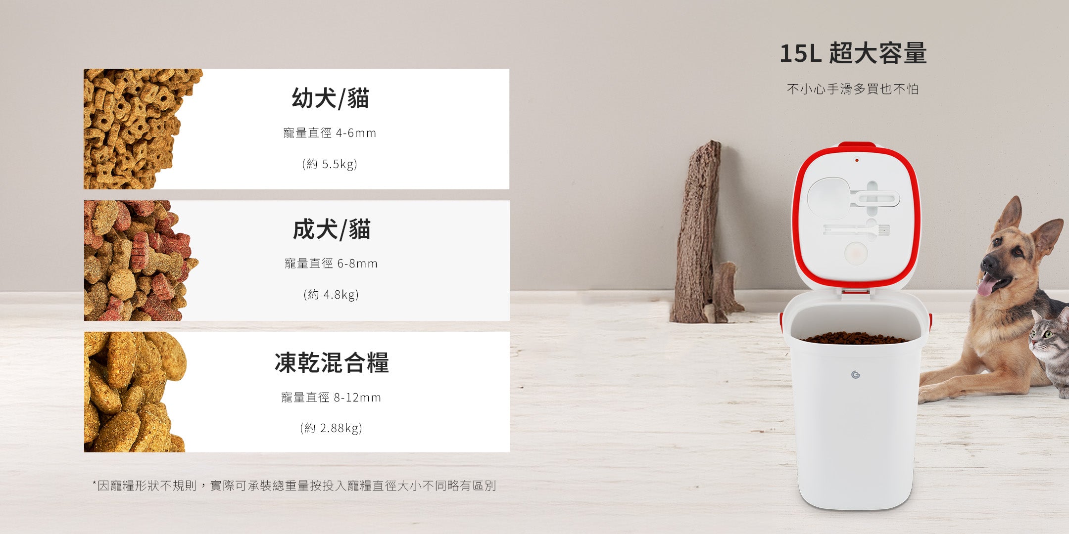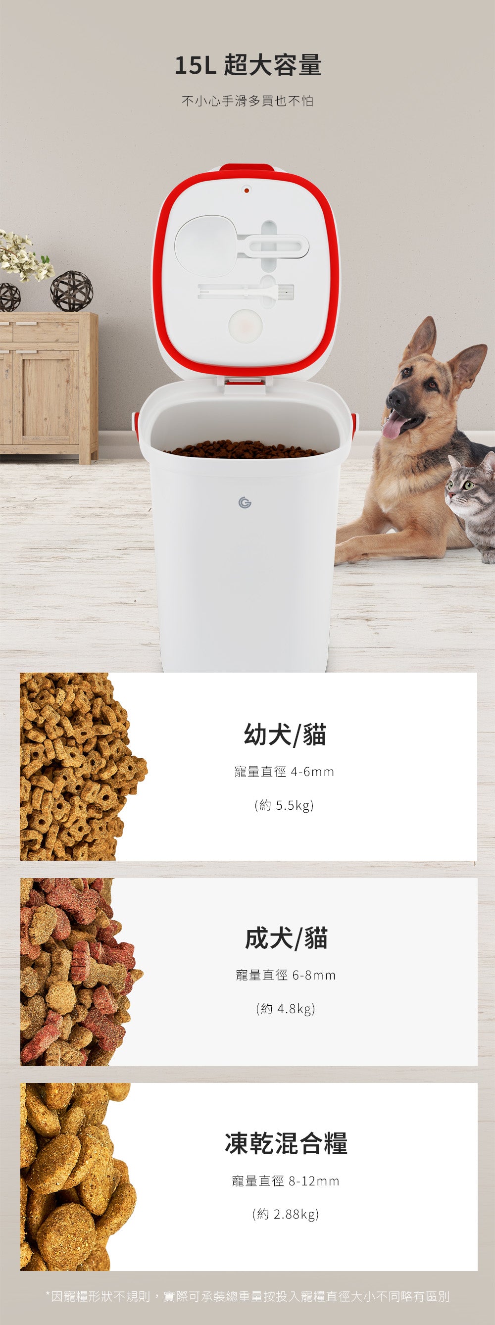 適用於米、麵粉、咖啡豆、茶葉、堅果、寵物飼料等乾糧,也可搭配真空袋存放生鮮食材。