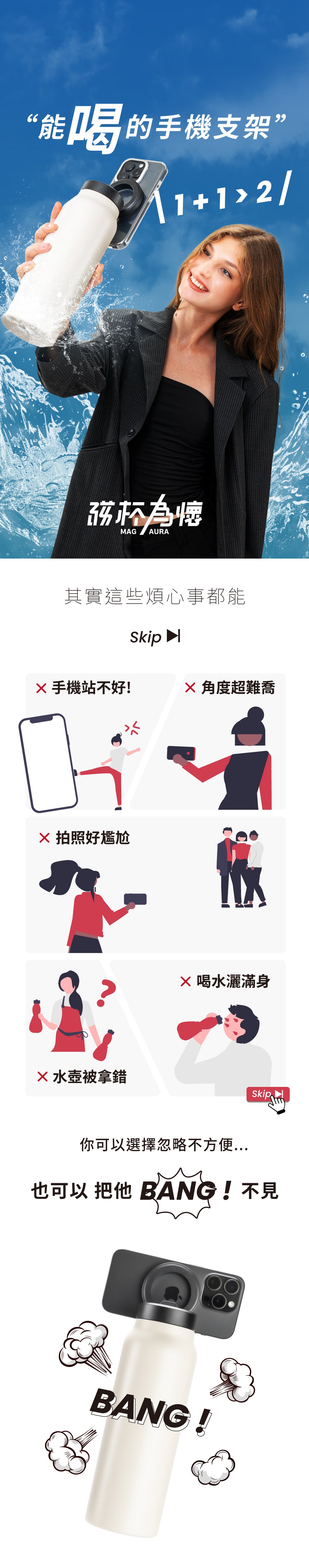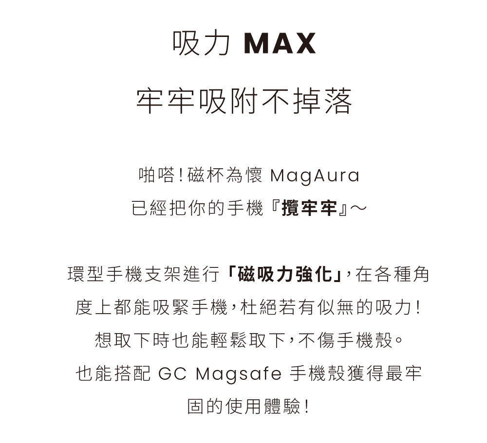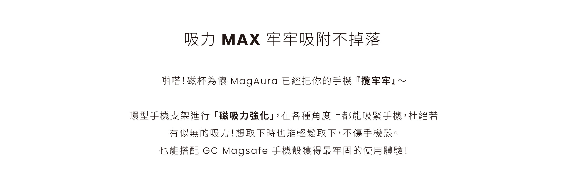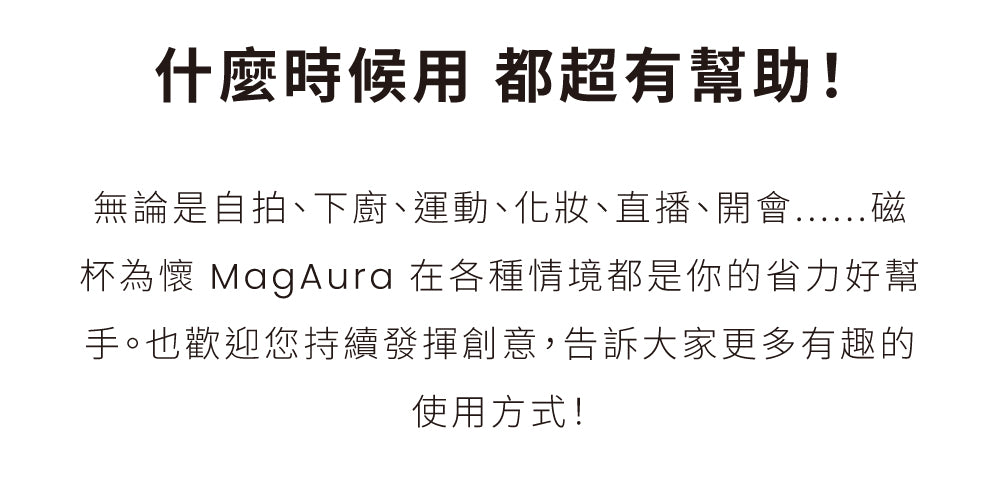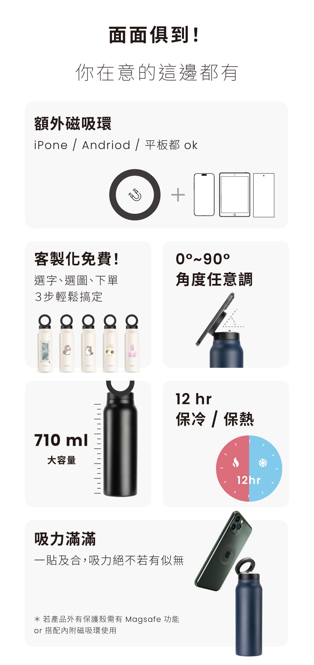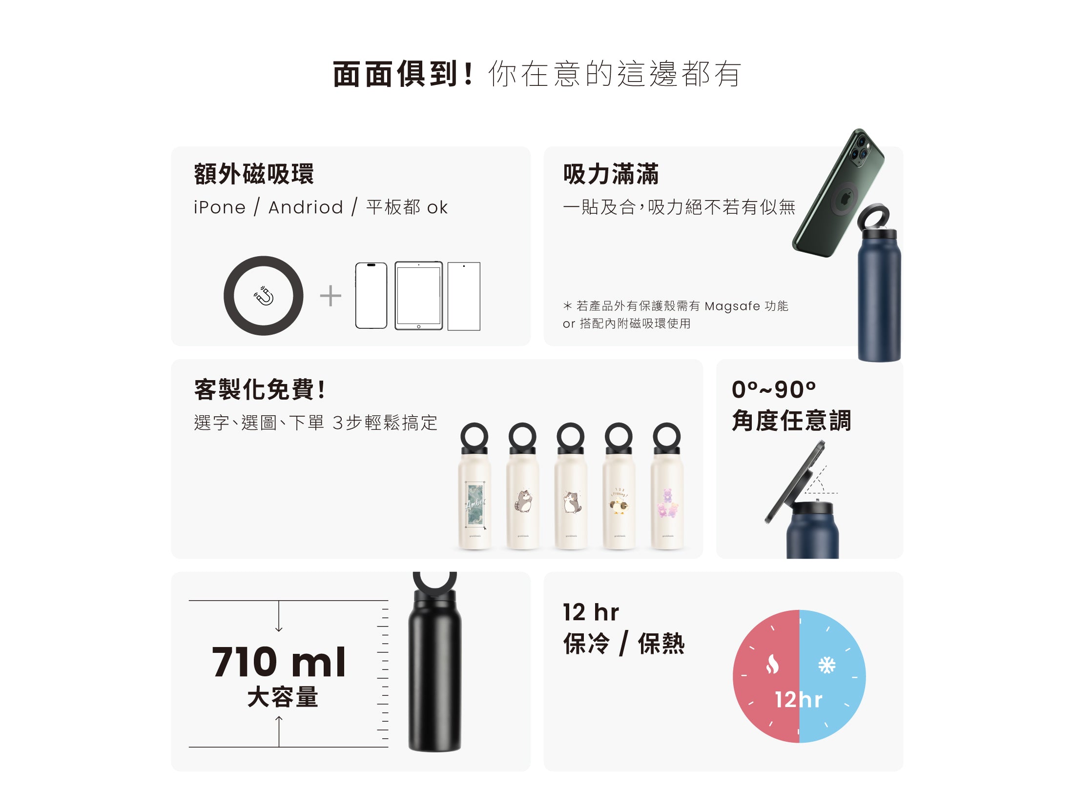 磁杯為懷 MagAura 磁吸保溫杯具備強力磁吸功能,可讓手機牢固吸附並 360 度旋轉。支架角度可調 0-90 度,適應多種使用需求。710ml 大容量確保全天水分充足。不銹鋼材質堅固耐用,保溫 12 小時,保冰 12 小時,內置吸管讓你無需開瓶即可輕鬆飲用。