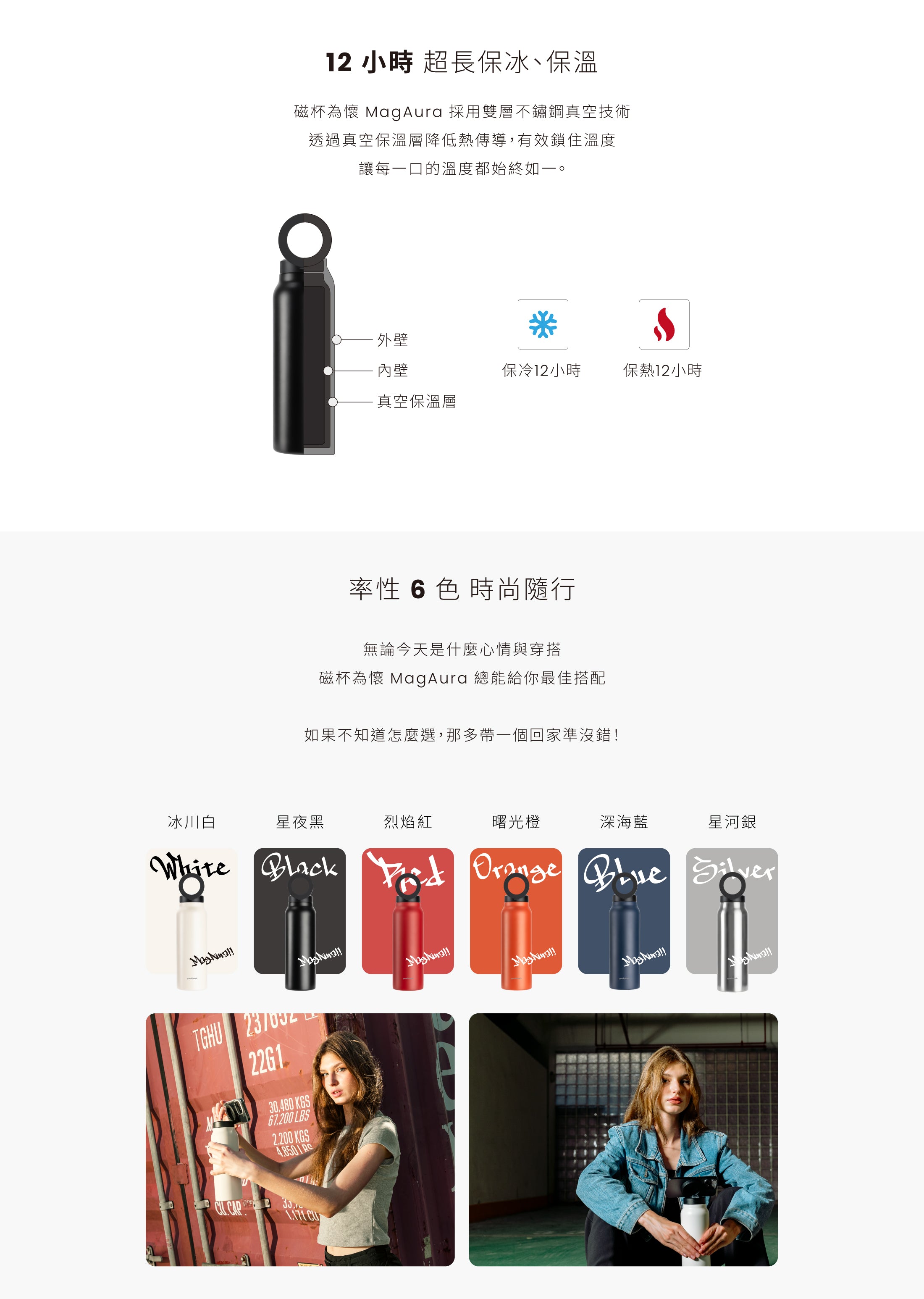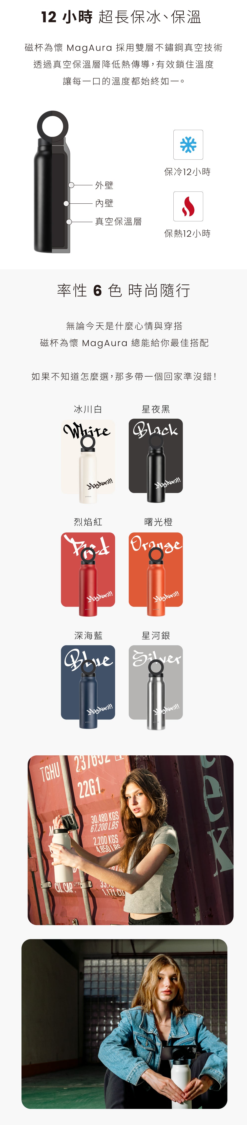 磁杯為懷 MagAura 使用雙層真空絕緣不銹鋼瓶設計,減少熱傳導速度,平均可保冷 / 溫12 小時。