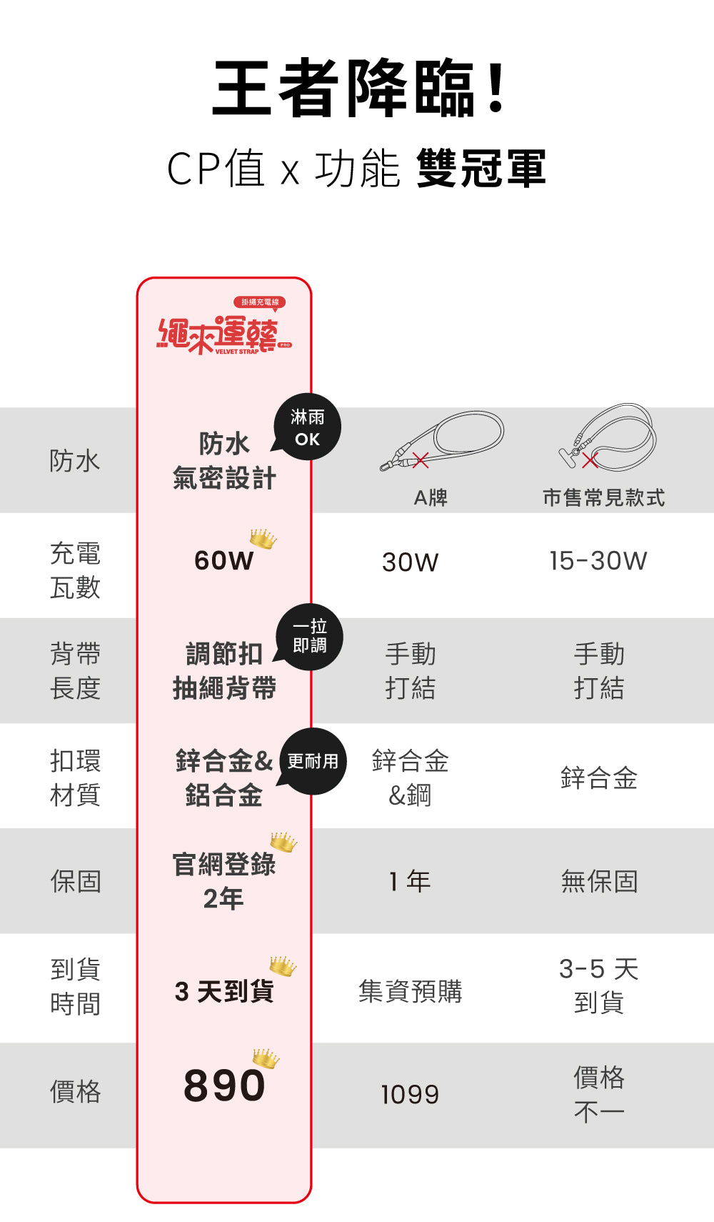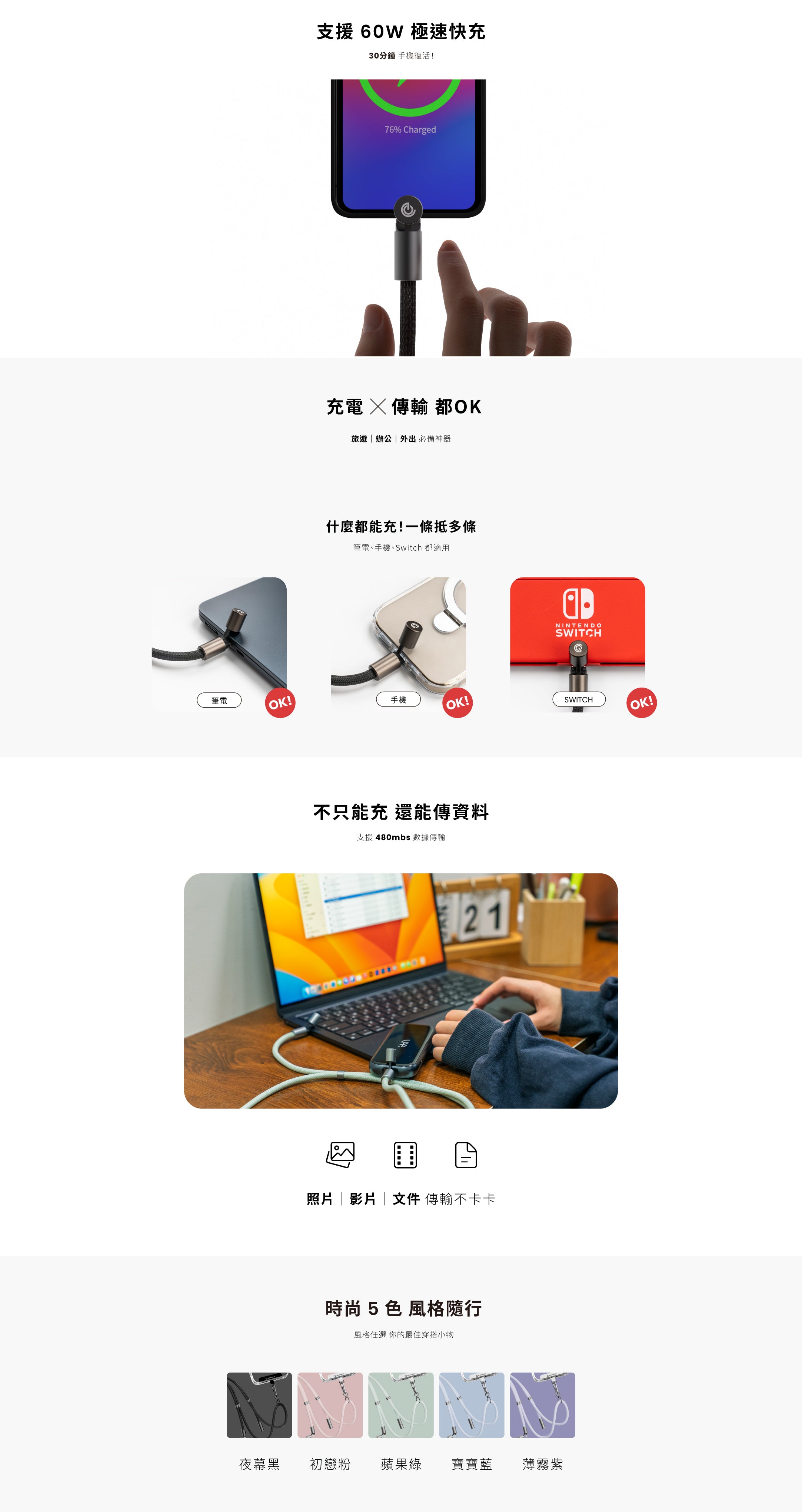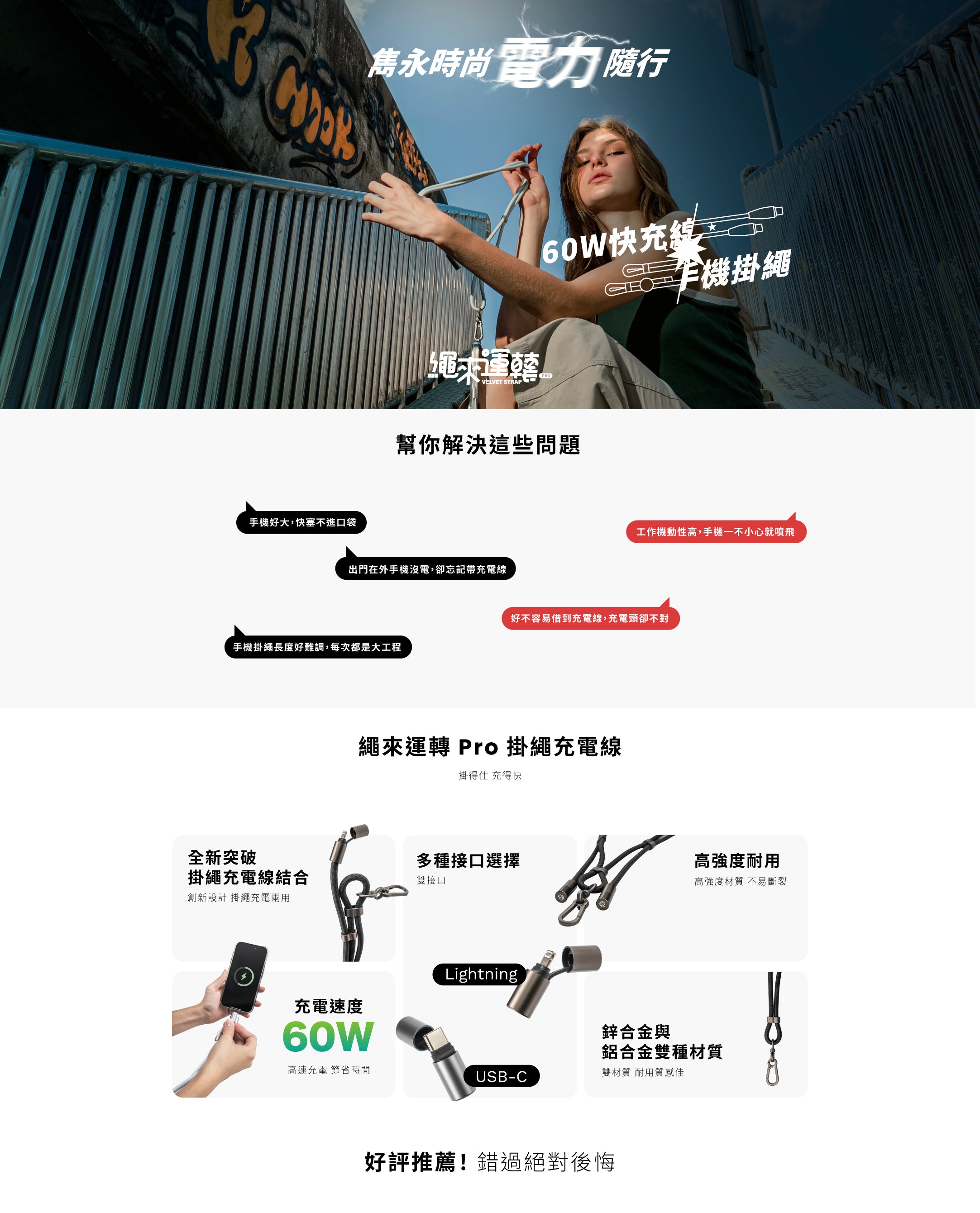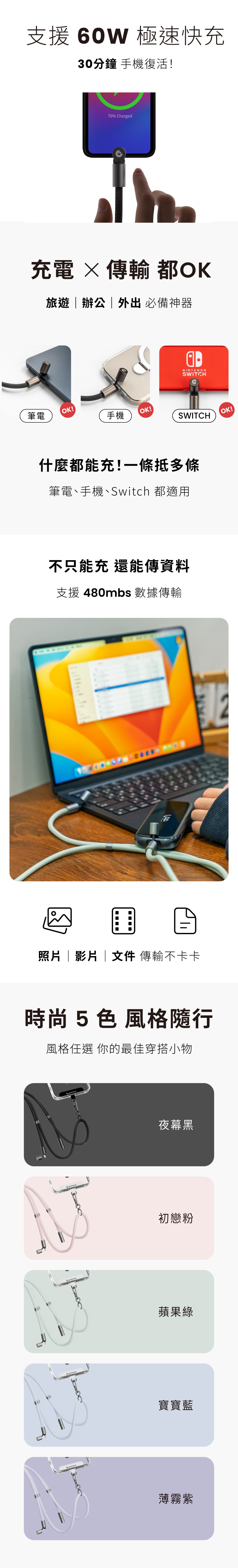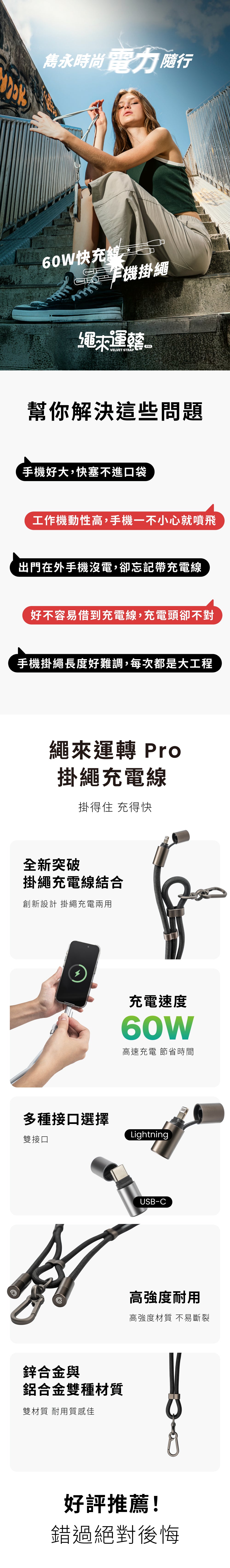 繩來運轉 Velvet Strap Pro 支持高達 60W 的快速充電,適合為各種設備快速補充電量。