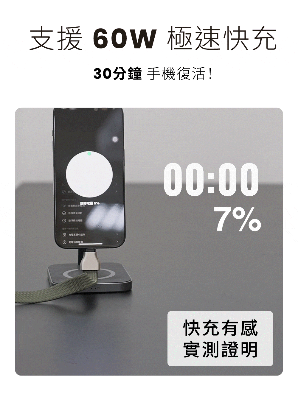 繩來運轉 Velvet Strap Pro 支持高達 60W 的快速充電,適合為各種設備快速補充電量。